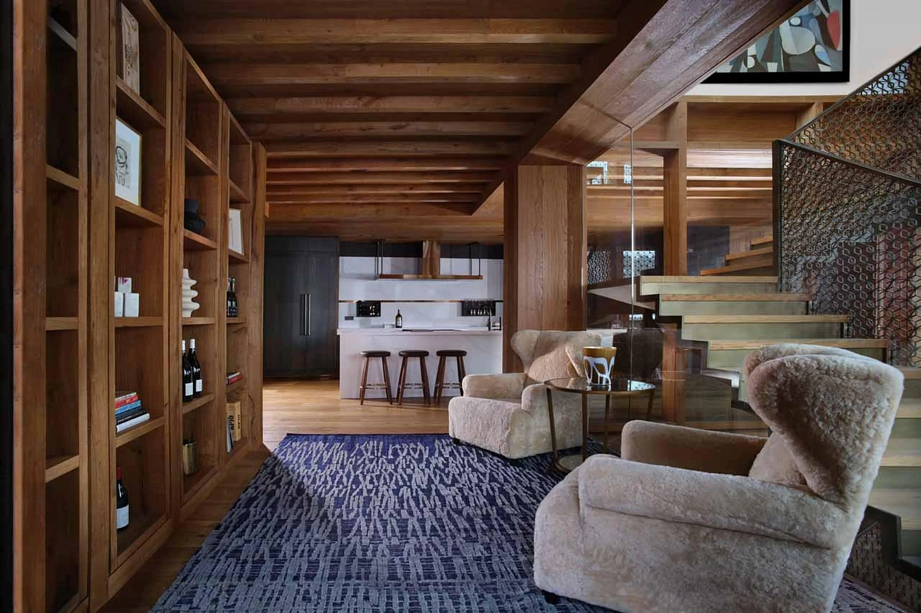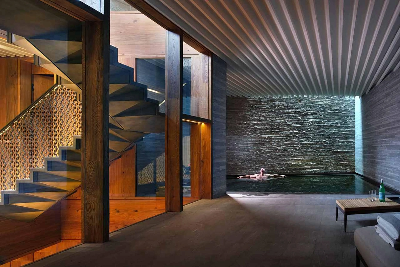 Beyond the main living area, the chalet unveils its world-class wellness floor, housing a stunning indoor swimming pool with a jacuzzi zone, a calming hammam, sauna, and a dedicated massage treatment room. For evening entertainment, descend to the lower-level cinema room, a multi-functional space equipped with a large screen, a well-stocked bar, and a games area with a pool table, all enhanced by the captivating window offering a view into the illuminated pool above.
