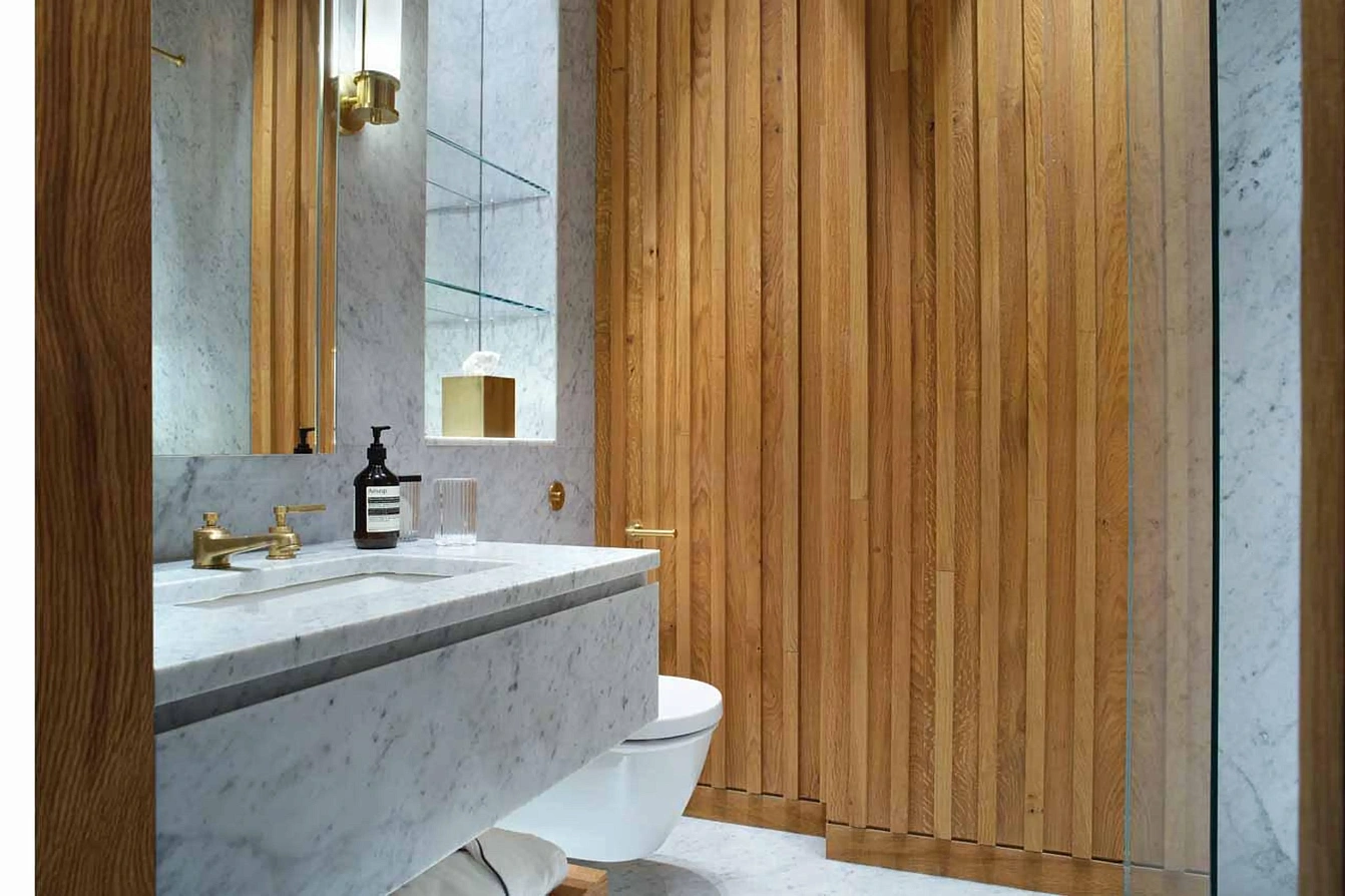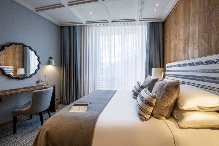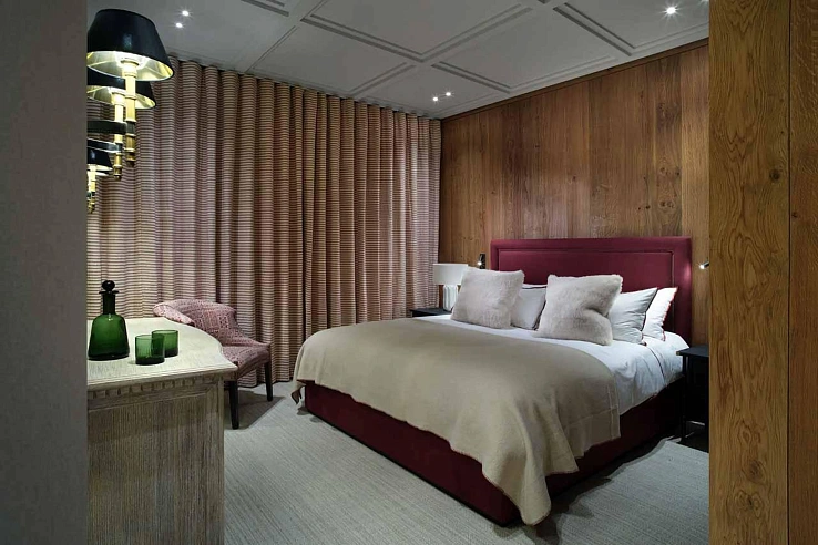 The chalet’s six bedrooms are a masterclass in tranquil, sleek alpine design. The pièce de résistance is the top-floor master suite, a private haven complete with a study, seating area, and a balcony featuring its own outdoor hot tub. The remaining bedrooms are thoughtfully distributed across the ground and lower levels, including fixed doubles with en-suite shower rooms and a flexible twin/double. For families or groups, a cozy bunk room sleeps four and is conveniently adjacent to a separate bathroom, with clever sliding door access to the entertainment area.