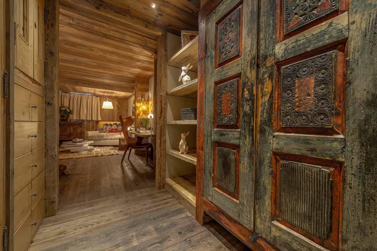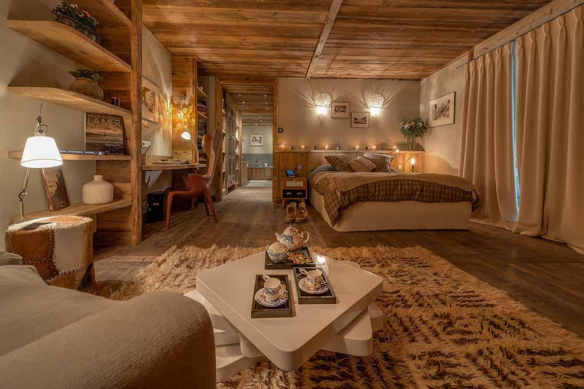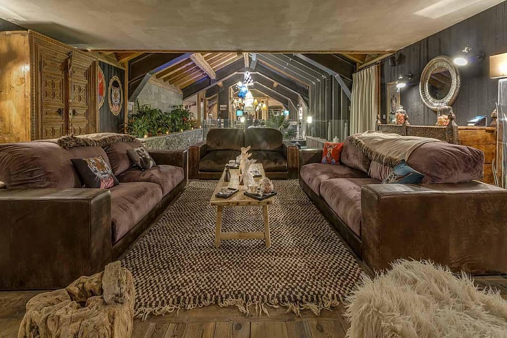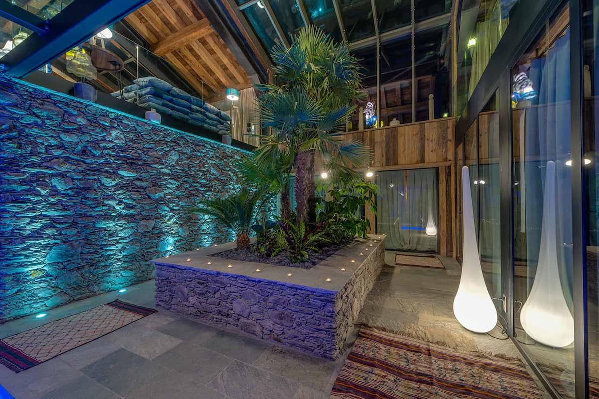 The main living area is located on the top floor, featuring a cozy sitting room and an elegant dining area separated by a stunning glass walkway that hovers over an indoor tropical garden. Unwind by the fireplace or enjoy an après-ski drink at the bar. The walkway leads to a large terrace, accessible from both sides.