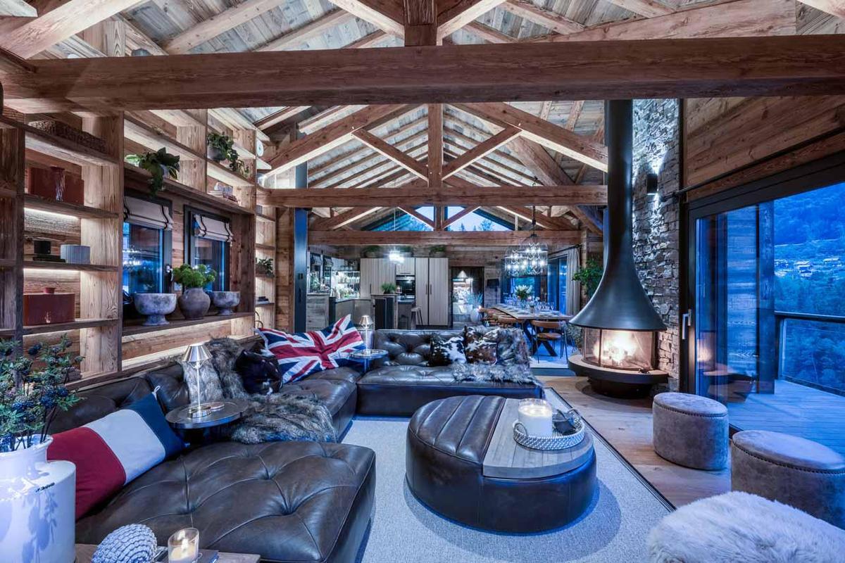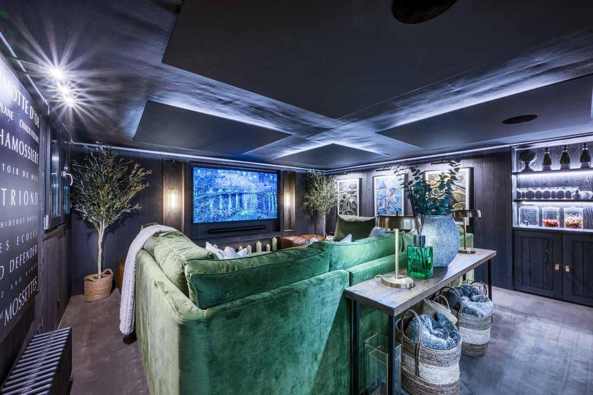 Ascend to the third-floor open-plan living space, where a vaulted ceiling and vast glazing capture the early and late alpine light. Here, a feather-edge wooden dining table seats 14 beneath ornamental chandeliers, while plush sofas gather around the modern fireplace. Sliding pocket doors retract fully to connect the salon with a south-facing balcony, erasing the line between indoors and the dramatic mountainscape. A dedicated cinema room offers deep sofas and popcorn-perfect evenings.