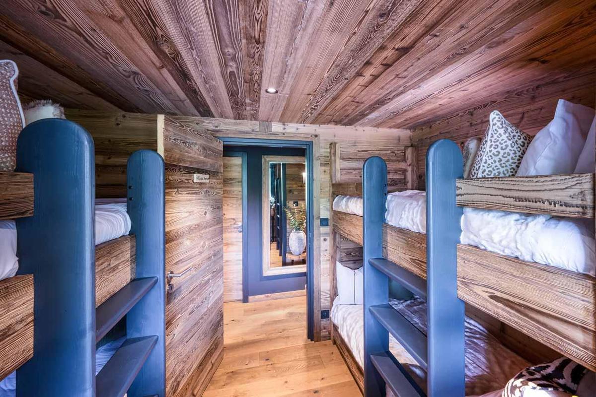 Sleeping 14 guests across six individually styled bedrooms, the layout offers supreme flexibility. The master suite commands the top floor with breathtaking mountain vistas and a walk-in rain shower. Four king/twin bedrooms (three en-suite) occupy the living level, most opening onto private or shared balconies. A lower-floor bunk room, furnished with four full-size singles, provides the perfect den for younger guests. A tranquil office nook with an Apple desktop offers a quiet workspace.