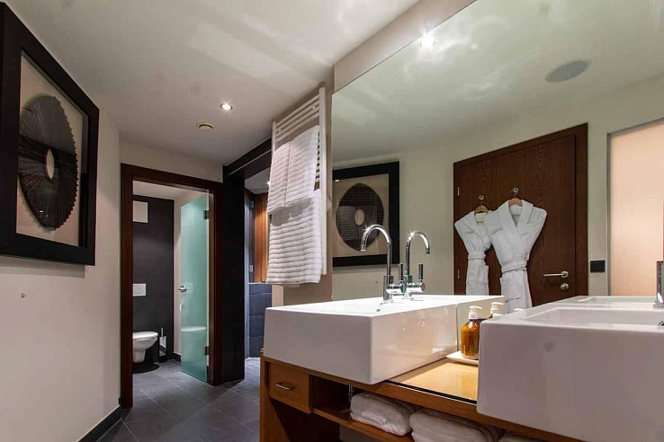 Each of the six generously proportioned bedrooms is dedicated to a deity from the Greek pantheon, offering a serene sanctuary with bespoke reclaimed wood furniture. All rooms provide the flexibility of double or twin configurations and are appointed with sumptuous Heirloom linens atop Hypnos cashmere mattresses. The en-suite bathrooms, crafted in Italian marble, feature rainforest showers; the principal suites, 'Zeus' and 'Hermes', are further enhanced with freestanding bathtubs and private balconies delivering south-easterly mountain views. Every chamber is fully integrated with a premium sound and vision system for personalized entertainment.