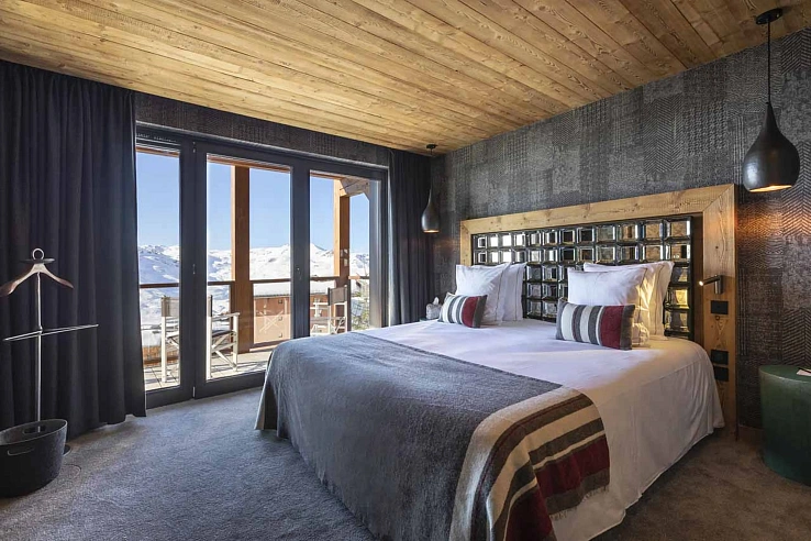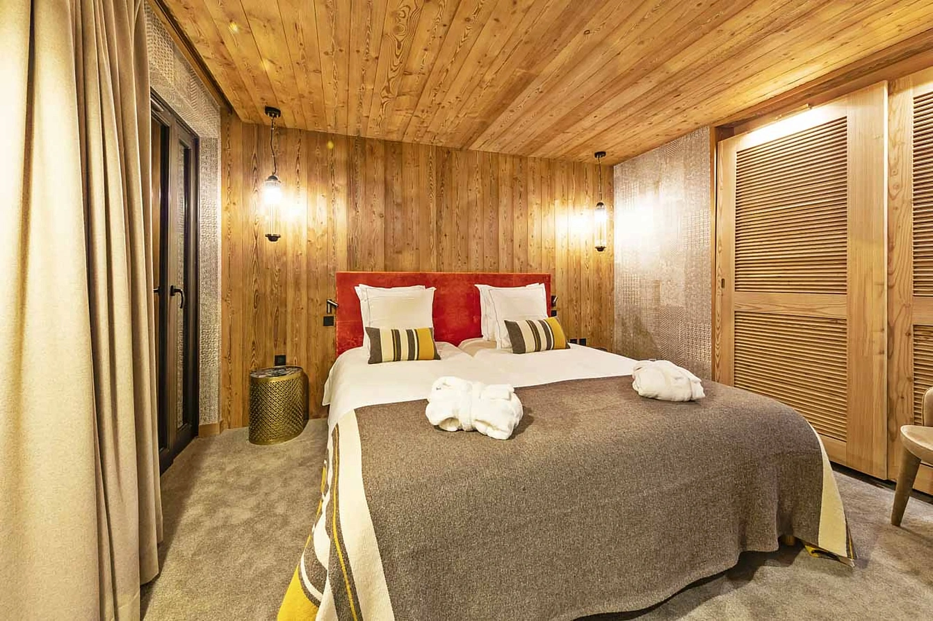 Poised on the edge of the blue Plein Sud piste, сhalet Cullinan enjoys a privileged ski-in/ski-out position just 150 metres from the lifts, while the vibrant heart of Val Thorens is a mere 10-minute stroll. Designed to host up to 12 guests in supreme comfort, the chalet spans four floors serviced by a private elevator. The magnificent third-floor living space is the social heart, centred around a sleek fireplace and opening onto a vast balcony with stunning southerly views. The interior is a sophisticated dialogue of spruce, larch, leather, and luxurious fabrics, creating an ambience of rustic-modern elegance.