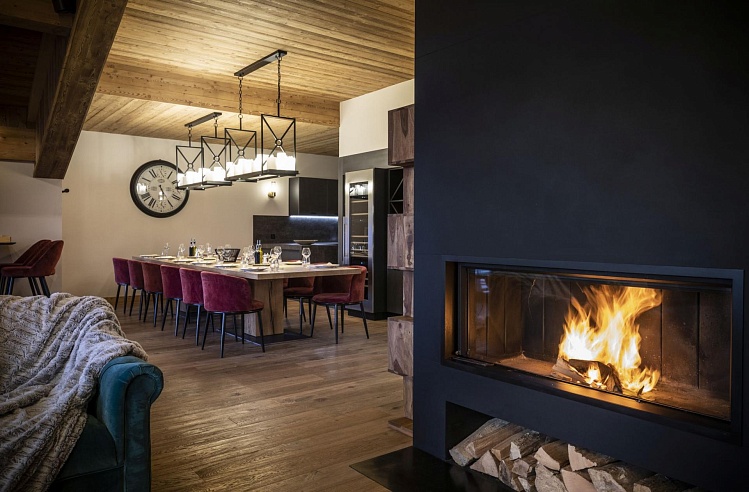 This impressive chalet masterfully combines traditional wood and stone with bold, modern accents—think striking chandeliers, rich leather sofas, and natural wool textures. Spread across 340m², it features a luminous open-plan living area with a central fireplace, a south-facing balcony, a state-of-the-art kitchen, a dedicated home cinema, a games room, and a sumptuous 55m² private wellness area complete with a Jacuzzi, sauna, and fitness space.