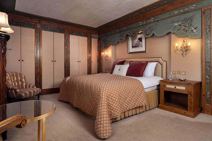 Just 25 metres from the Cospillot piste in the private community of Le Hameau de Bellecote, Cour746 offers the ultimate prize of ski-in/ski-out access. The heart of the home is the first-floor living area, an open-plan space where plush sofas gather around a roaring wood-burning fireplace. This sociable hub is anchored by a grand dining table, positioned to admire the coffered ceilings and an elegant chandelier that casts a warm glow over intimate gatherings. The chalet’s unique character is defined by its hand-painted detailing and rich, jewel-toned fabrics, creating an ambiance of timeless elegance.