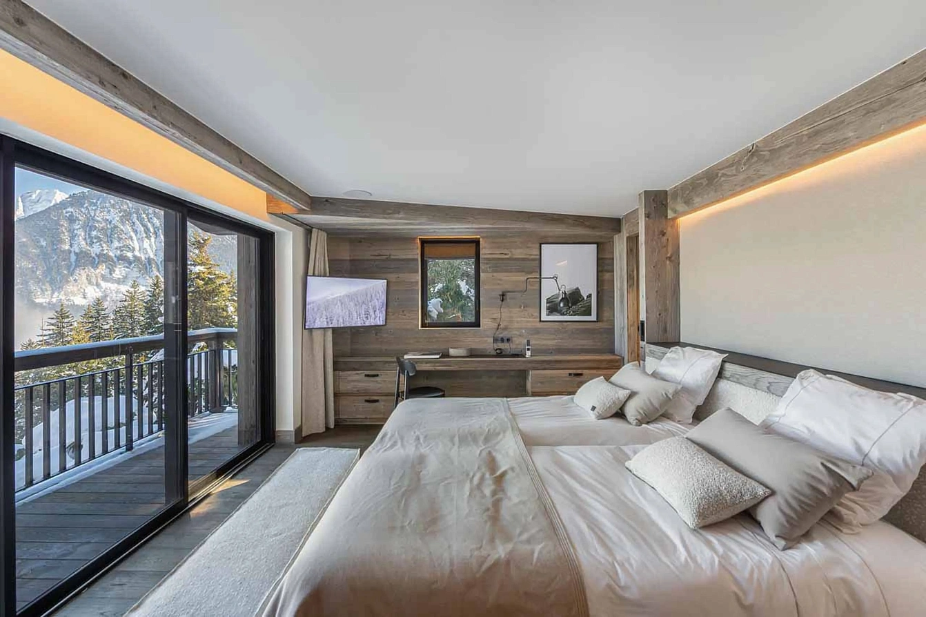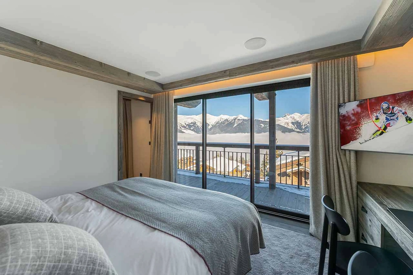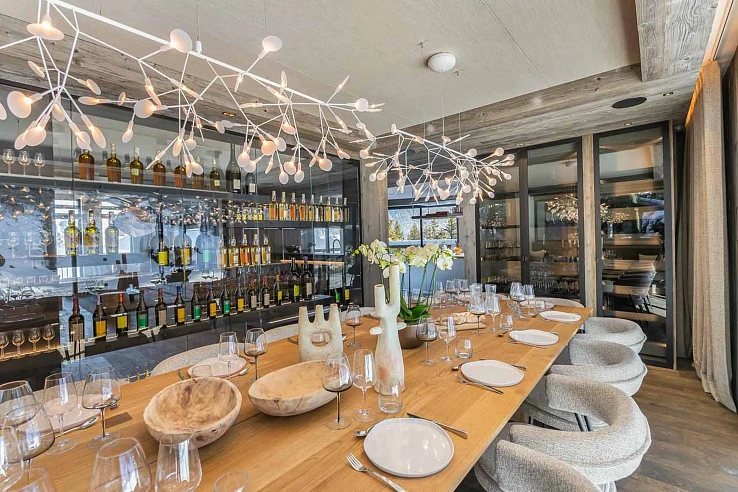 Commanding an enviable ski-in, ski-out position in Courchevel 1550, this 830 sqm retreat accommodates up to 15 guests across six double bedrooms and a children’s suite. The heart of the chalet unfolds on the third floor: an expansive, open-plan living area where contemporary design—featuring weathered wood, wool wall hangings, and clean lines—frames a grand fireplace, a sleek bar, and a formal dining space. Vast balconies offer panoramic mountain vistas, seamlessly blending indoor elegance with the alpine outdoors. Key amenities include a private elevator, a cinema room, and a games lounge.