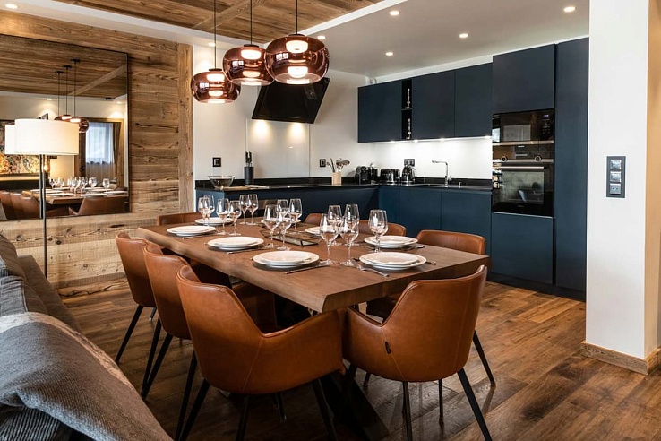 Step into a sophisticated mountain ambiance. Val-448occupies the first floor of the desirable Alaska Lodge Residence. The heart of this 98m² apartment is its inviting open-plan living space. Here, refined alpine chic – think rich textures, dark woods, curated artwork, and a striking moose head – creates a warm yet elegant atmosphere. Sink into plush sofas by the gas fireplace, gaze out at majestic peaks through large windows, and flow effortlessly onto your furnished terrace, crowned by the bubbling hot tub. The adjacent kitchen, equipped for effortless self-catering including a Nespresso machine, connects to a distinctive wooden dining table beneath statement bronzed lights, perfect for shared meals.