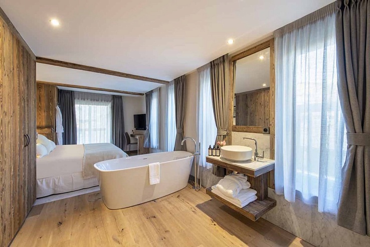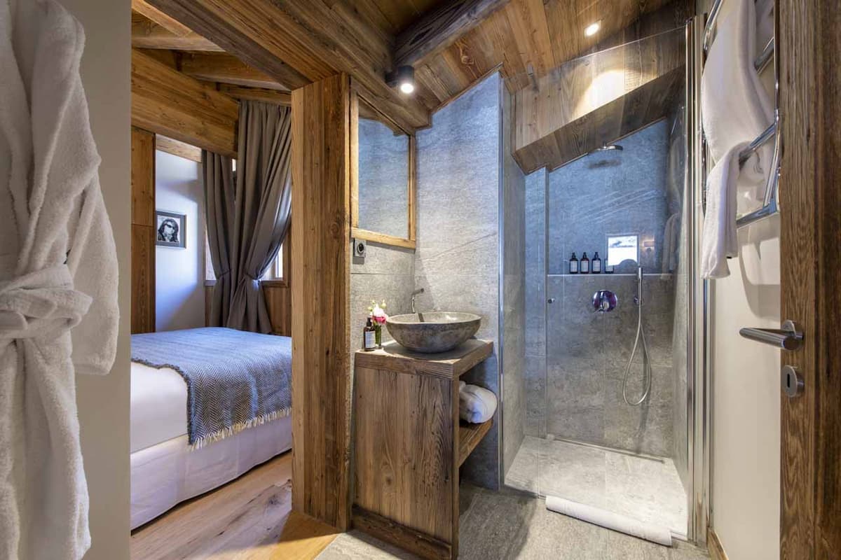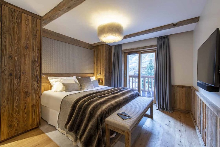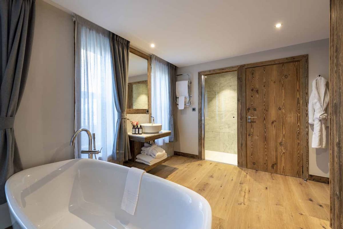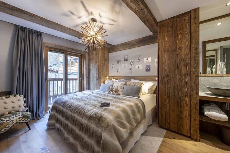 Val-212 hosts up to eight guests in four en-suite bedrooms. On the first floor, the master bedroom features a freestanding bathtub in the center of the room and a separate shower. There are also two additional en-suite twin/double bedrooms with balcony access. The final bedroom, situated under the eaves on the top floor, offers mountain views from the bed and an en-suite shower room.