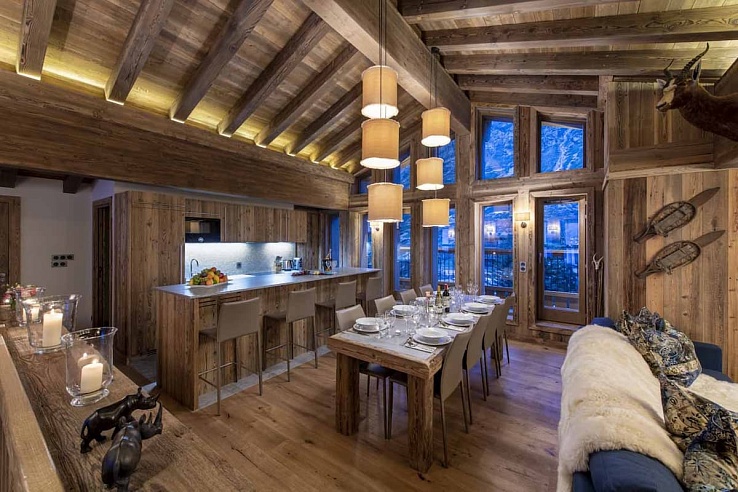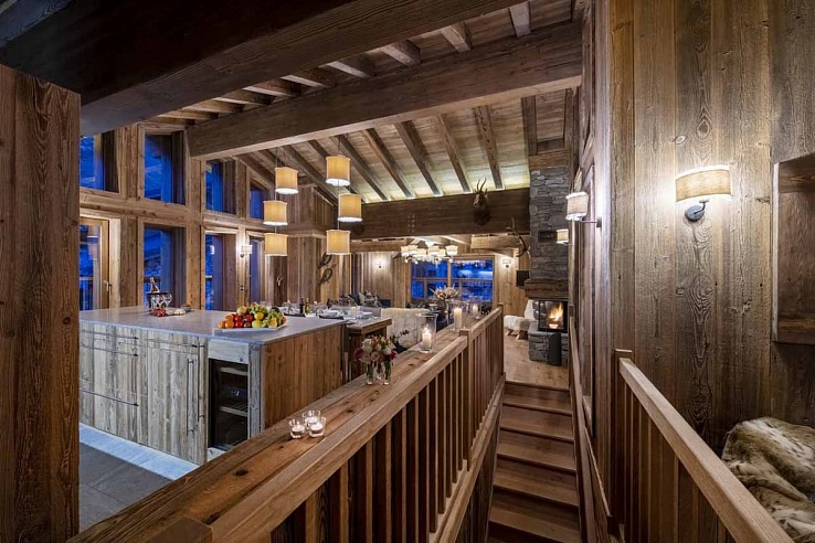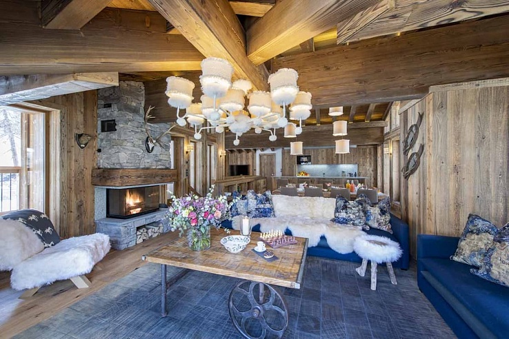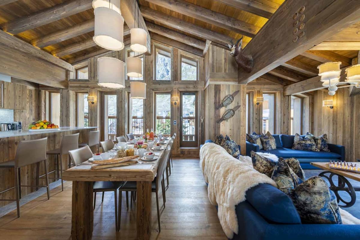 The top floor features an expansive communal space with double-height ceilings, exposed beams, and large windows that showcase stunning mountain views. The apartment blends modern elegance with natural materials, pendant lighting, and alpine-themed décor. The open-plan living area includes plush sofas around a charming stone fireplace.
