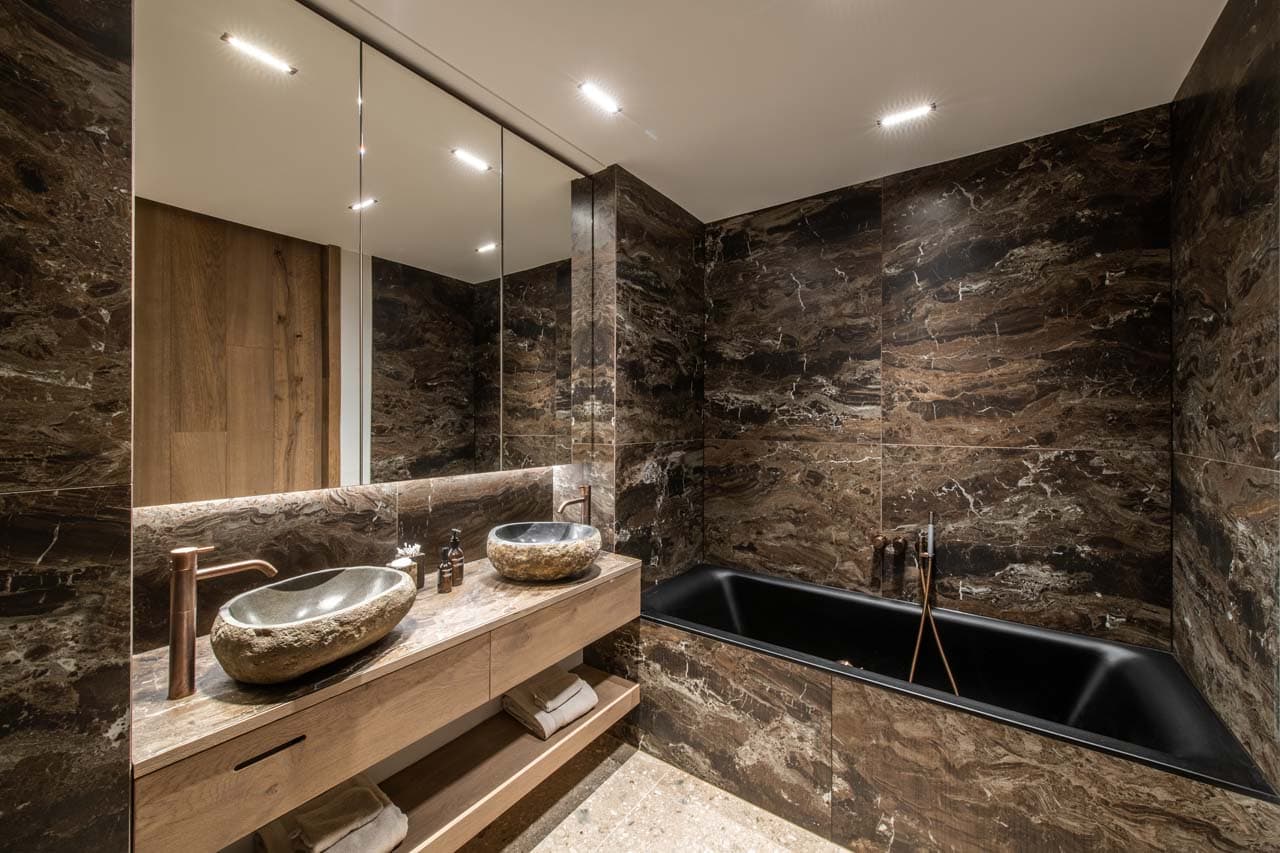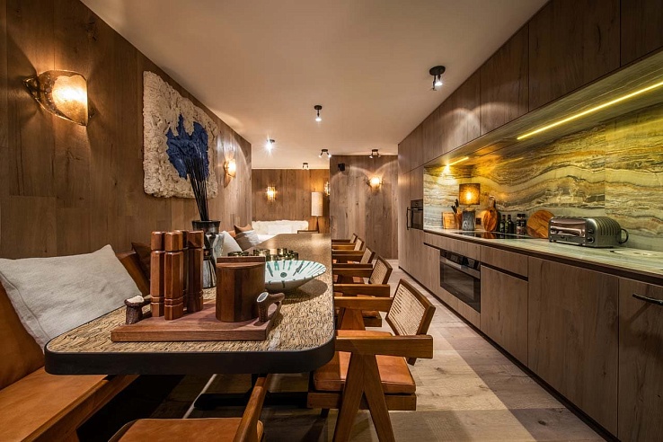 The apartment exudes Alpine sophistication, marrying natural materials like local stone and wood with warm, earthy tones. Retro accents—think mid-century furniture and bold artworks—add a playful twist, creating a unique ambiance of cozy glamour. Floor-to-ceiling details, from woolly sheepskins draped over the sofa to sleek electric fireplaces, ensure a snug, inviting atmosphere.