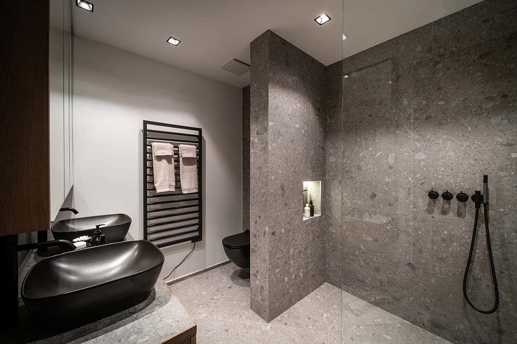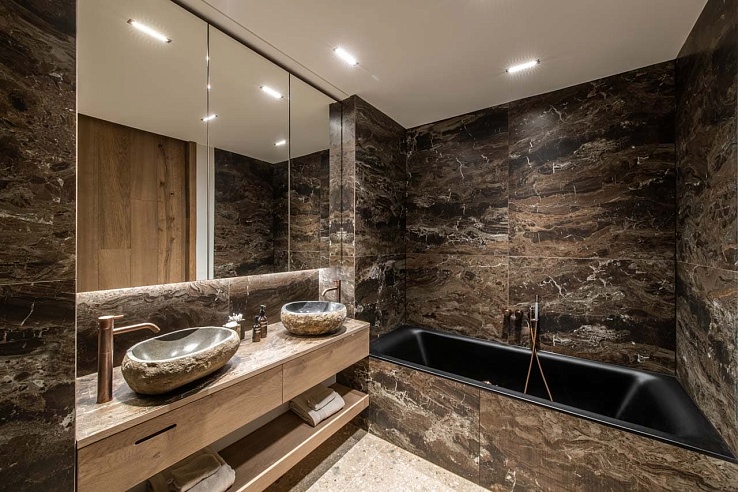 Three king-size bedrooms, each with en-suite shower rooms, sleep up to six guests. Designed for tranquility, the rooms highlight Alpine textures and soft hues, offering serene sanctuaries after days on the slopes.