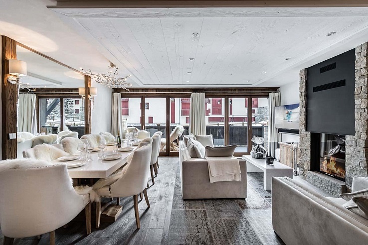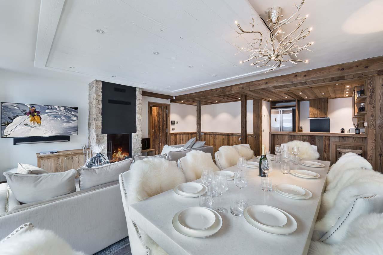 Perfectly positioned between the slopes and the town centre, Val-459resides in the coveted Le Petit Alaska neighbourhood. This 115m² duplex unfolds over two levels, masterfully marrying traditional heavily beamed ceilings with an audacious palette of luxury materials: think rich leather, warm aged timber, cool stainless steel, textured stone, sumptuous furs, and intricate tapestries. The heart of the home is the open-plan living area, where a striking basalt fireplace anchors the lounge, leading seamlessly to a dining suite and a gourmet kitchen featuring premium appliances and a breakfast bar. Expansive glass doors flood the space with light and open onto balconies framing quintessential Alpine vistas, creating niches perfect for après-ski relaxation or morning coffee.