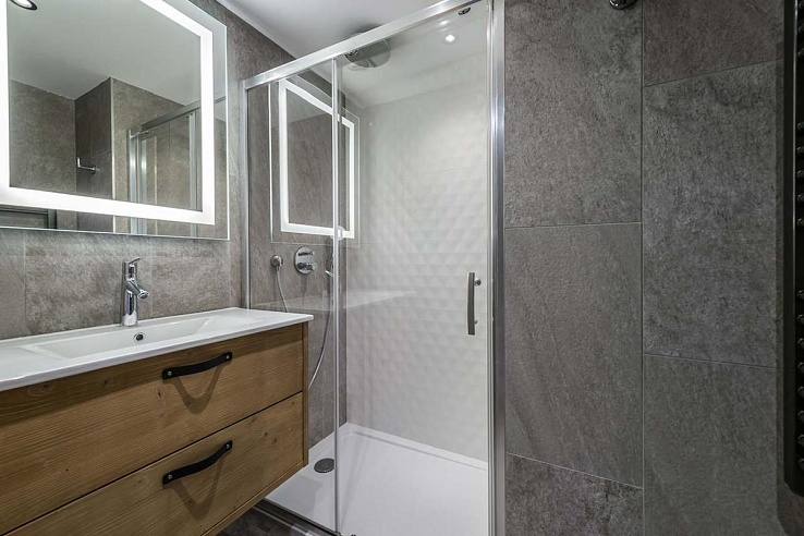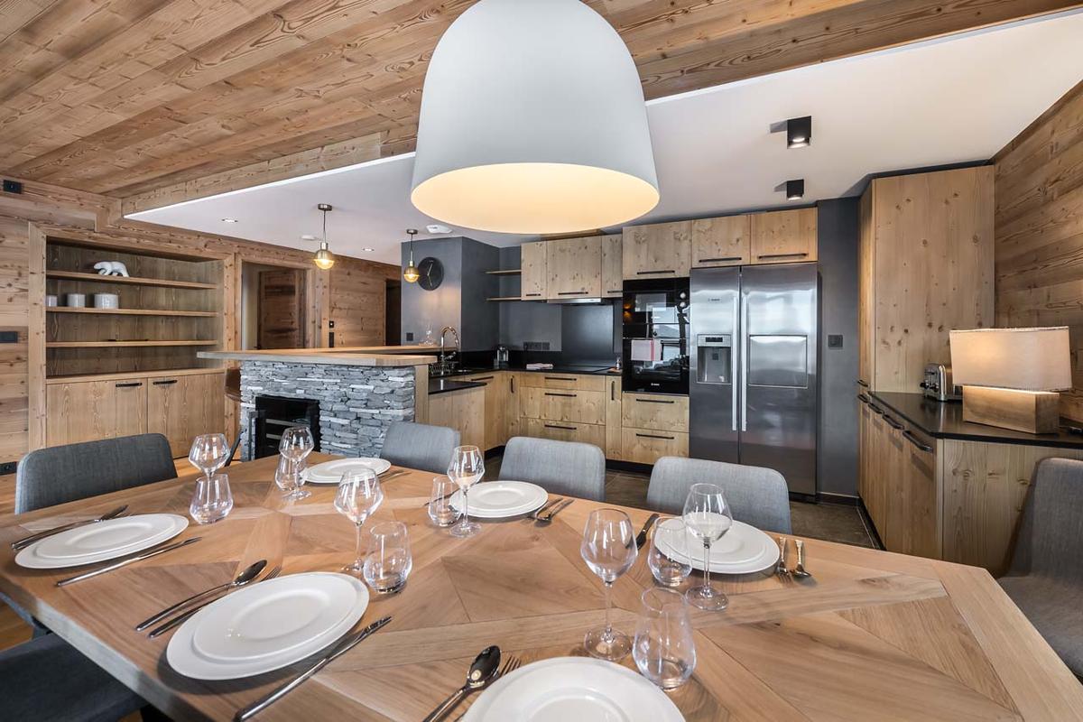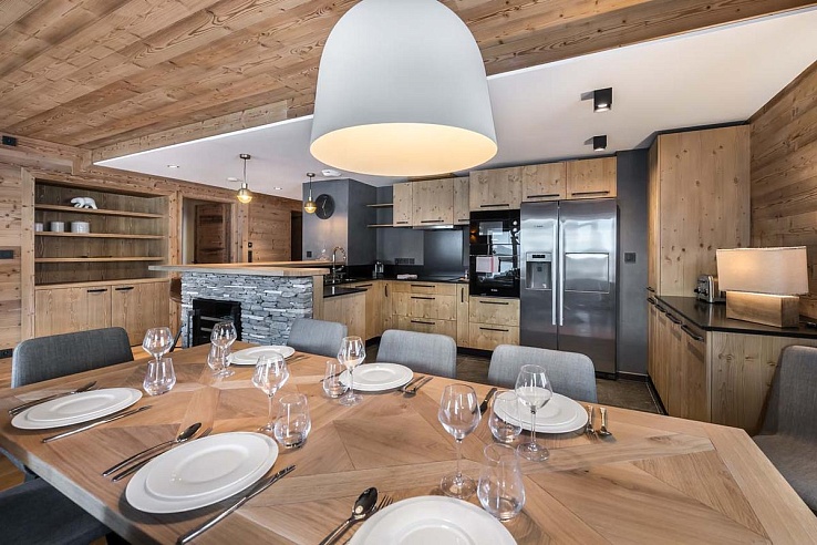 Occupying the third and fourth floors of the exclusive Myrtille residence (just seven apartments in total), Lorenzo places you at the foot of Solaise forest. The snow front and main lifts—Olympique cable car, Solaise gondola—are a 4-minute walk, with ski-back access to your door. Val d’Isère’s charming Old Town—bustling with boutiques and trendy cafes—is 6 minutes away. Designed to flood living spaces with natural light, the open-plan layout blends contemporary lines with rustic alpine materials: think exposed timber, local stone, and bespoke finishes. Unwind in the lounge where oversized sofas embrace a crackling fireplace, framed by dual balconies showcasing the legendary La Face piste. The chef-ready kitchen features a breakfast bar, premium appliances, and a dedicated wine fridge, flowing seamlessly into an eight-seat dining area.