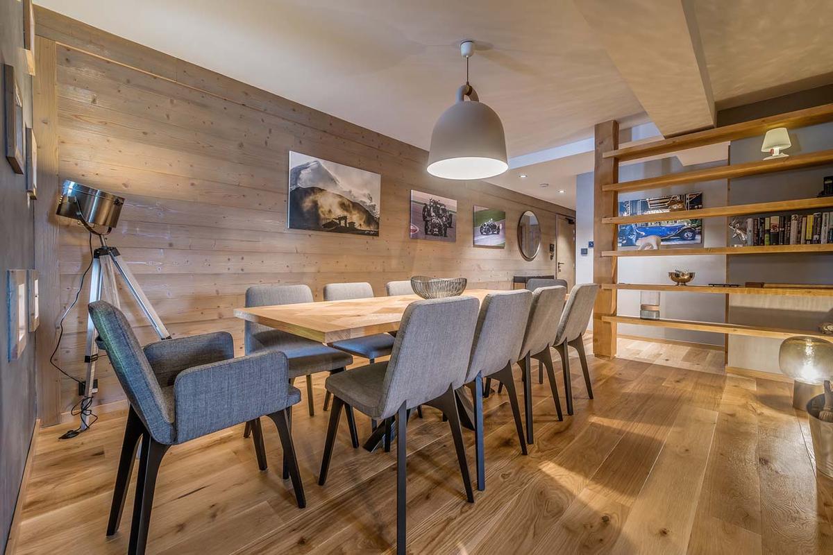 The heart of the apartment is undoubtedly the spacious living area, designed for shared moments – unwind by the fire after conquering the slopes, plan the next day's adventures over drinks, or enjoy a film night. The expansive dining area and well-appointed kitchen facilitate memorable group meals. Practical luxury is assured with a dedicated utility room inside the apartment for ski wear and a heated, shared ski and boot locker at the building entrance. A covered parking space for one vehicle adds significant convenience for airport transfers or exploration.