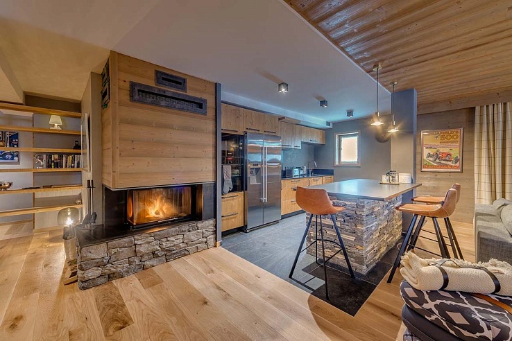 Step into an atmosphere of relaxed elegance. The open-plan living and dining space embodies contemporary "alpine chic," featuring plush seating gathered around a welcoming modern fireplace and a large flat-screen TV. Expansive windows flood the area with light and frame breathtaking panoramas of the La Face descent. Doors open onto a private terrace, perfect for apres-ski contemplation. A sleek, fully-equipped kitchen boasts a generous breakfast bar, integrated dishwasher, and a dedicated wine fridge, catering to both casual meals and sophisticated gatherings for up to eight guests.