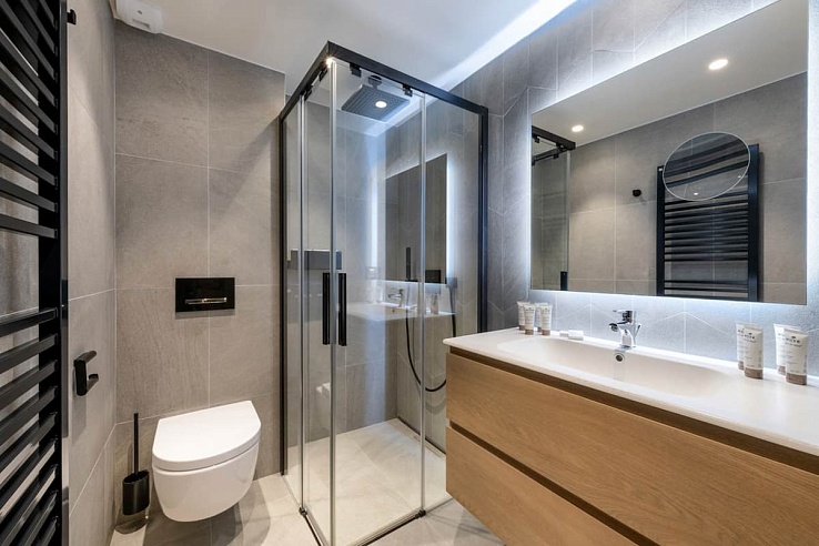 Positioned in the exclusive Legettaz neighbourhood, Apartment A01 (116m²) places you just 400m from Val d’Isère’s main lift hub and snow front, with the vibrant resort centre a 10-minute walk. Accommodating 6 adults and 2 children, its open-plan living space marries modern alpine design with a stone fireplace, L-shaped sofa, and an 8-seater dining area. Floor-to-ceiling doors open to a balcony framing mountain vistas—ideal for morning coffees amid crisp alpine air. The sleek, fully equipped kitchen complements the residence’s fusion of timber and stone finishes, embodying rustic-chic elegance.
