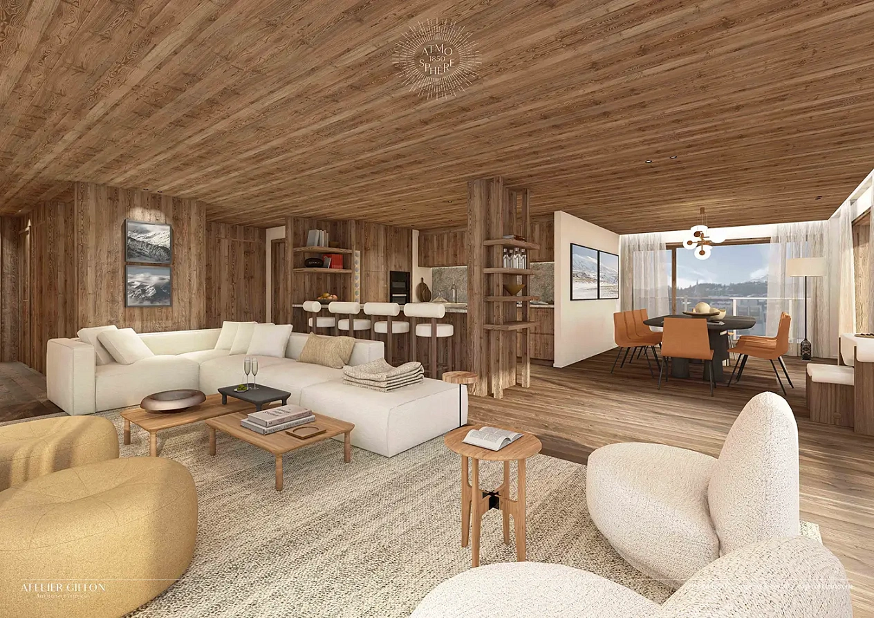 Nestled in the prestigious Atmosphere Residence, this 189m² apartment enjoys a prime position in the heart of Courchevel 1850. Designed all in one level for seamless living, it accommodates eight guests with ease. The open-plan living area is a masterclass in alpine modernism, featuring an inviting sitting area with a wrap-around sofa and a contemporary fireplace, an elegant dining space, and a sleek kitchen with a central island. Expansive glass doors flood the space with light and open onto the balcony, framing breathtaking mountain panoramas. The interior aesthetic is a sophisticated blend of natural materials and contemporary comfort, creating an atmosphere of authentic yet refined mountain living.