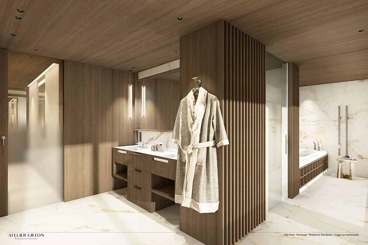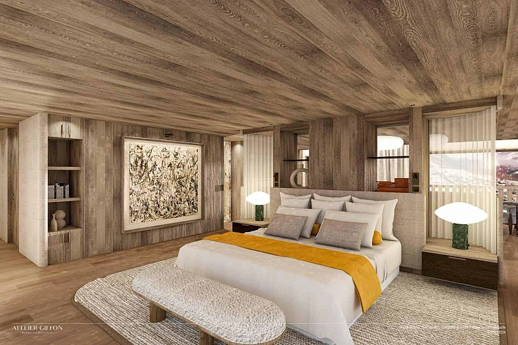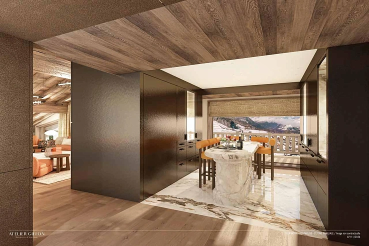 Spanning an impressive 680 m² across the top three floors, the penthouse features a private wellness area with a sauna and hot tub, a dedicated massage room, and bar. The interior is a masterclass in alpine chic, where natural materials, warm textures, and panoramic terraces create a seamless connection to the mountain landscape. Guests also enjoy privileged access to the residence's 600 m² spa, gourmet restaurant, and in-house ski shop.