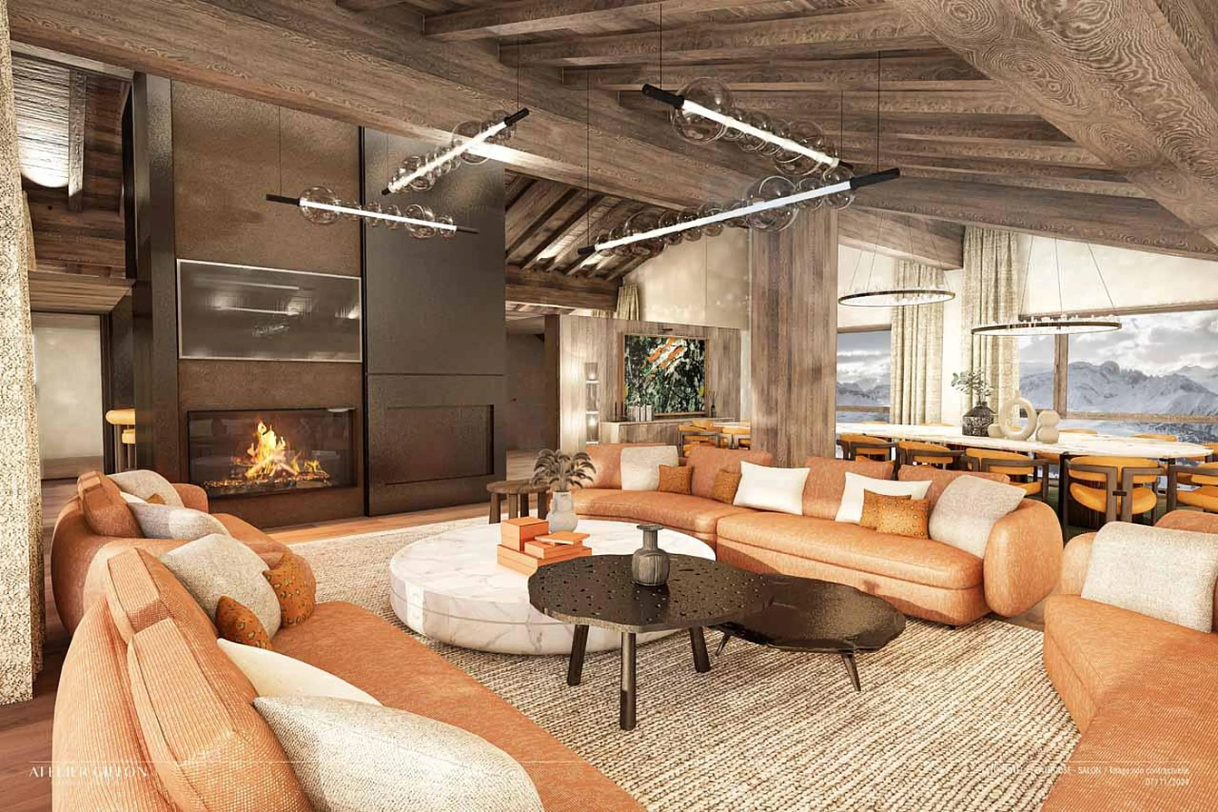 Occupying the 10th, 11th, and 12th floors in the very heart of Courchevel 1850, Cour555 is the epitome of slope-side sophistication. This expansive residence accommodates up to 15 guests across seven beautifully appointed bedrooms. The main living area is a dramatic, open-plan space where plush sofas and a dining area are elegantly divided by a central island fireplace, offering an ideal setting for grand-scale entertaining with stunning alpine views. The design ethos blends contemporary luxury with rustic charm, featuring exposed wood, stone, and sophisticated finishes throughout.