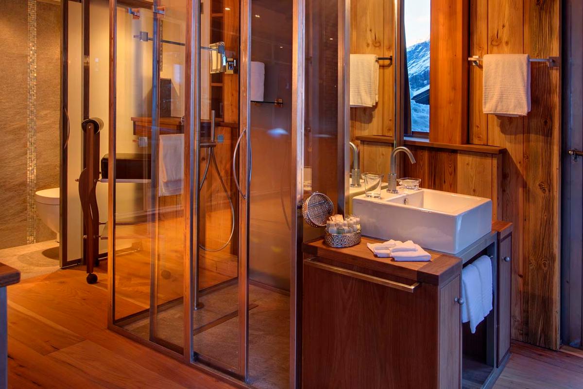 Crafted with local larch, the chalet seamlessly blends modern design elements with expansive glass panels, offering guests unparalleled 360-degree views of the village and the iconic Matterhorn. The chalet's heart is its expansive open-plan area, defined by soaring gables, where a chic living, dining, and kitchen ensemble awaits, anchored by a warming fireplace and custom cowhide and leather seating.