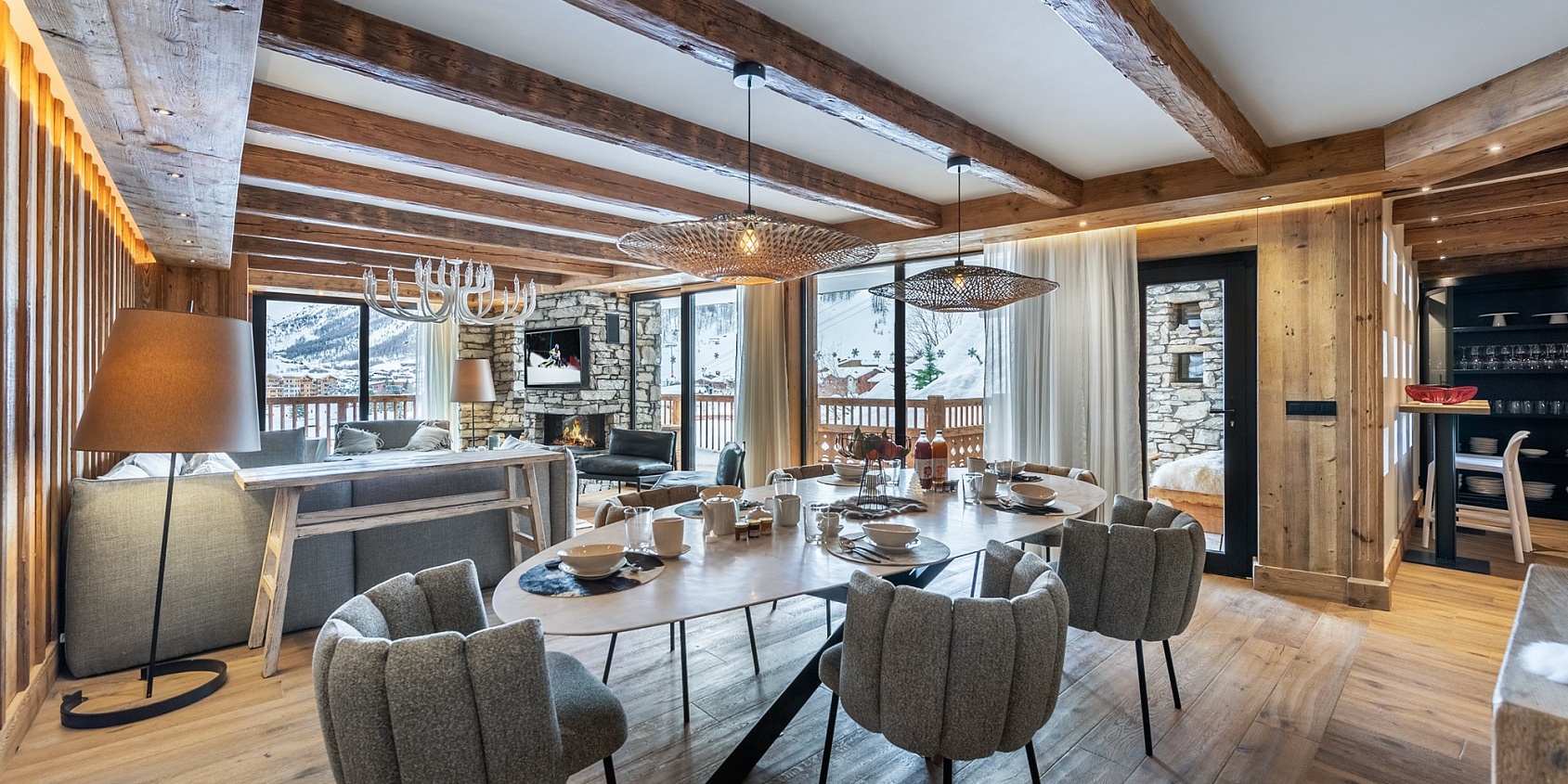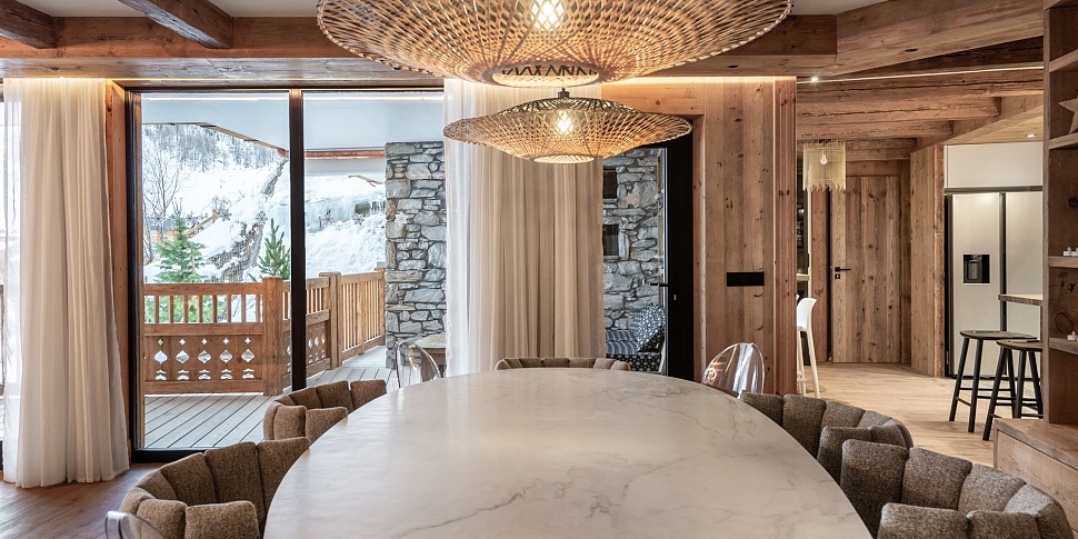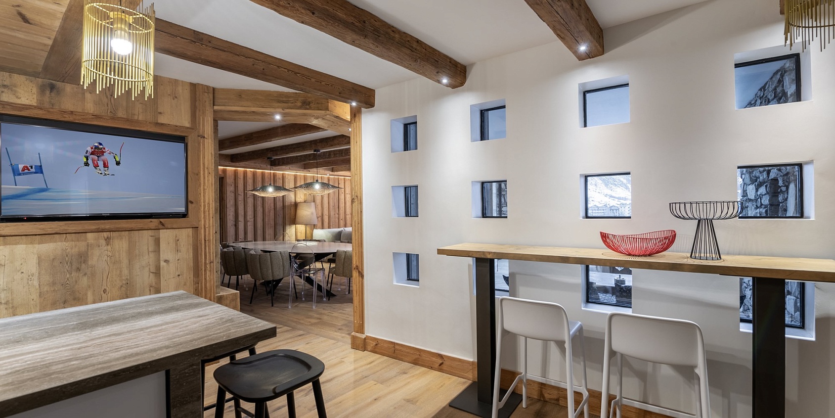 Penthouse Best View masterfully blends authentic Alpine character with modern luxury. The heart of the home is a vast open-plan living area, where exposed stone walls and rustic wooden beams are complemented by a plush wrap-around sofa and a welcoming fireplace. Floor-to-ceiling windows flood the space with light and provide direct access to the expansive terrace, framing the spectacular scenery of Val d'Isère and its slopes.