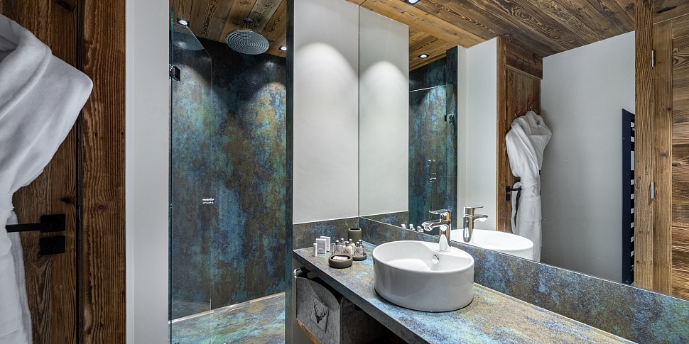 Each of the five elegantly appointed bedrooms is a private haven, complete with its own en-suite bathroom and a dressing room. Configured as doubles or twins to suit families or friends, they offer flexible comfort. The master suite enhances the experience further with a dedicated desk and direct terrace access through sliding glass doors, inviting you to wake up to the majestic mountain landscape.