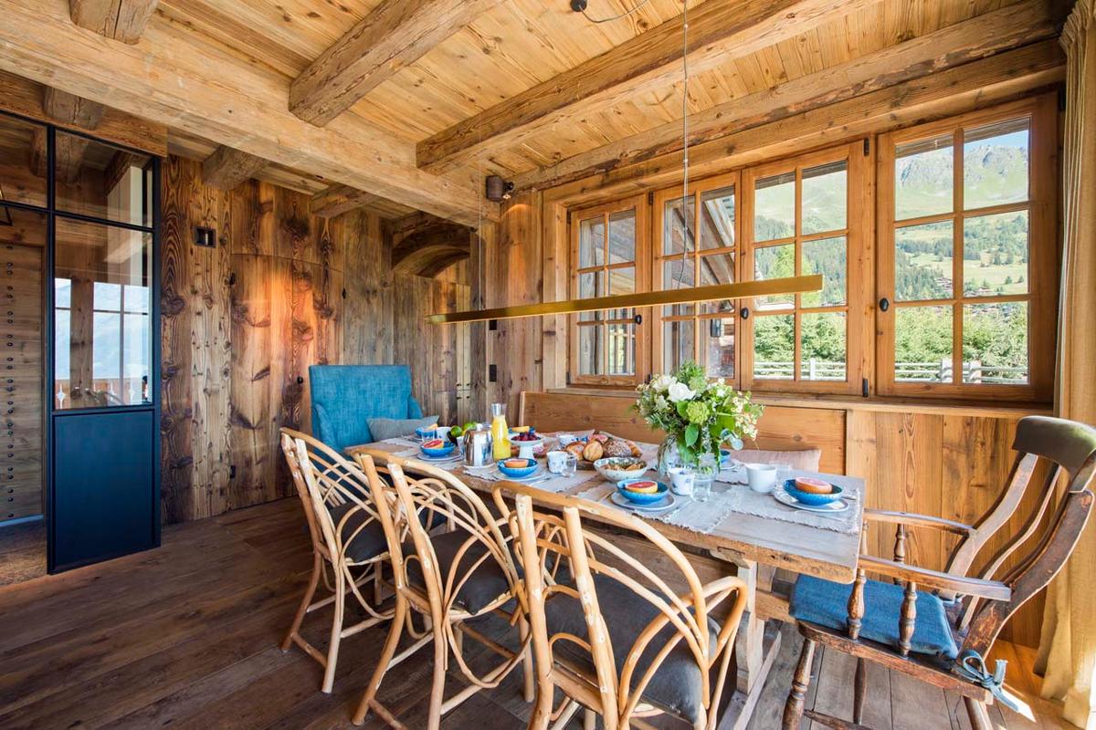 Upon entering the chalet, you step into the main living floor, dedicated to an open-plan living and dining room and a kitchen. Traditional aged wood, stylish furnishings, and subtle lighting create a delightful ambiance in this space. A generous open fireplace and comfortable sofas complete the room while floor-to-ceiling French windows open onto a spacious balcony, offering a breathtaking view of snow-covered mountains in the distance.