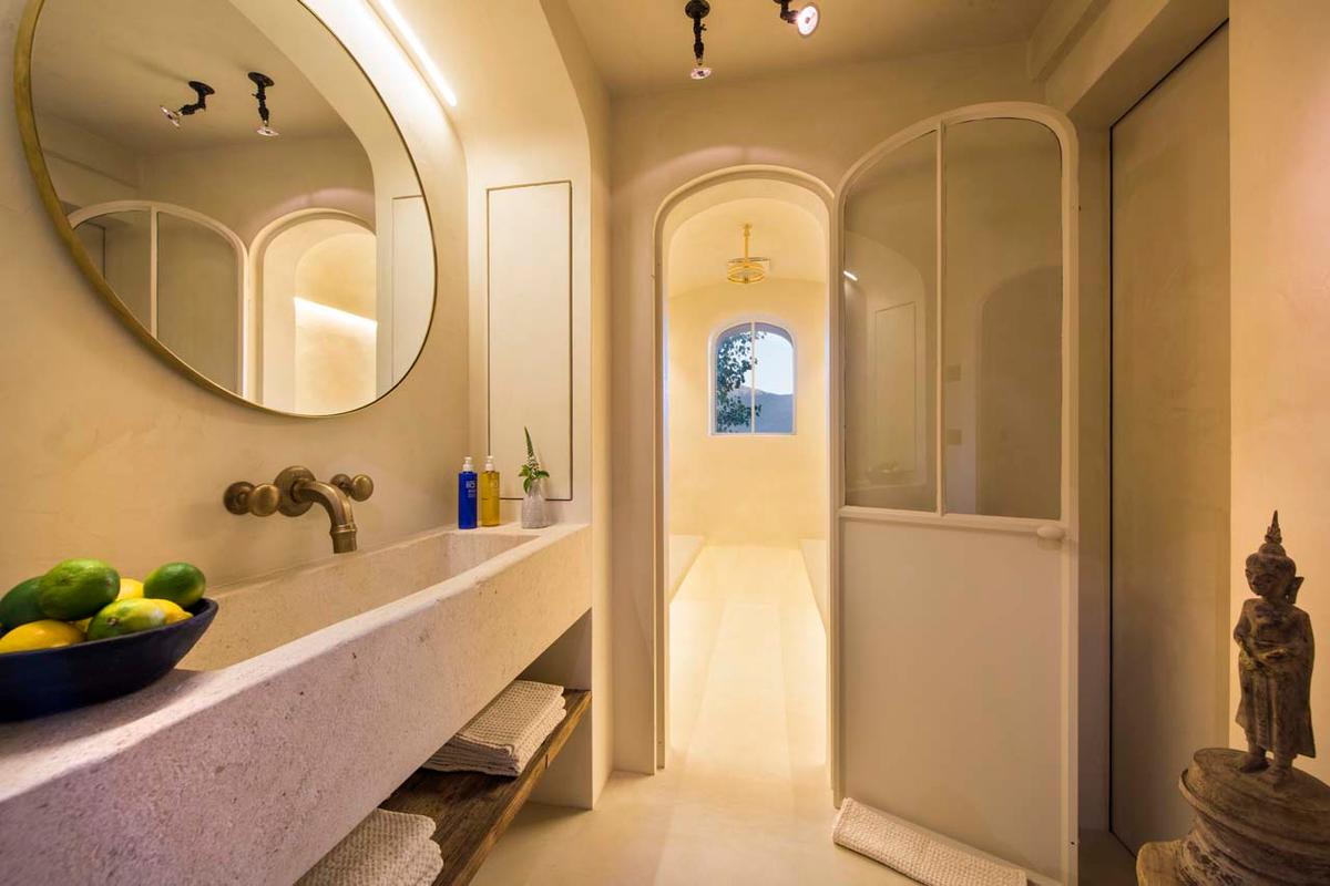 The top floor houses the splendid master bedroom, featuring its private balcony and seating area, a modern en-suite bathroom, and a separate shower. Also on this level is a bunk room with a private shower room. The ground floor hosts two additional double bedrooms with floor-to-ceiling windows, opening onto the terrace and garden. These bedrooms share a bathroom with a shower.