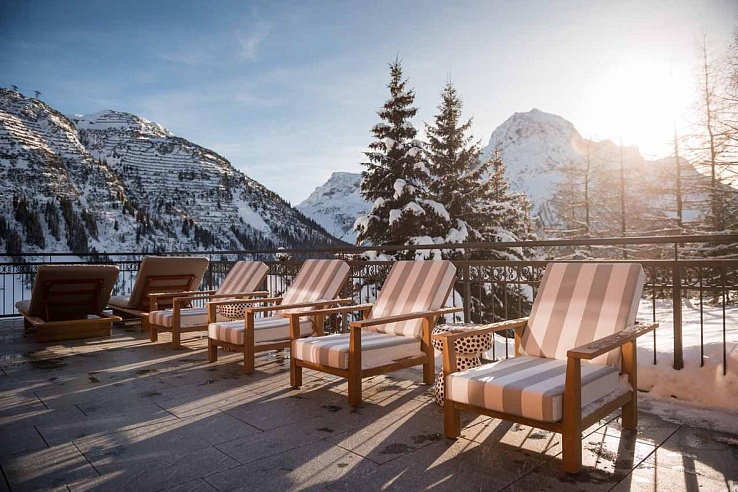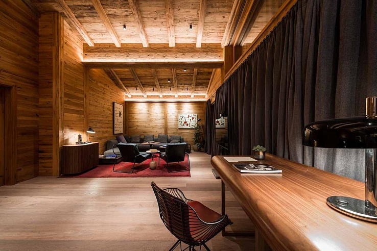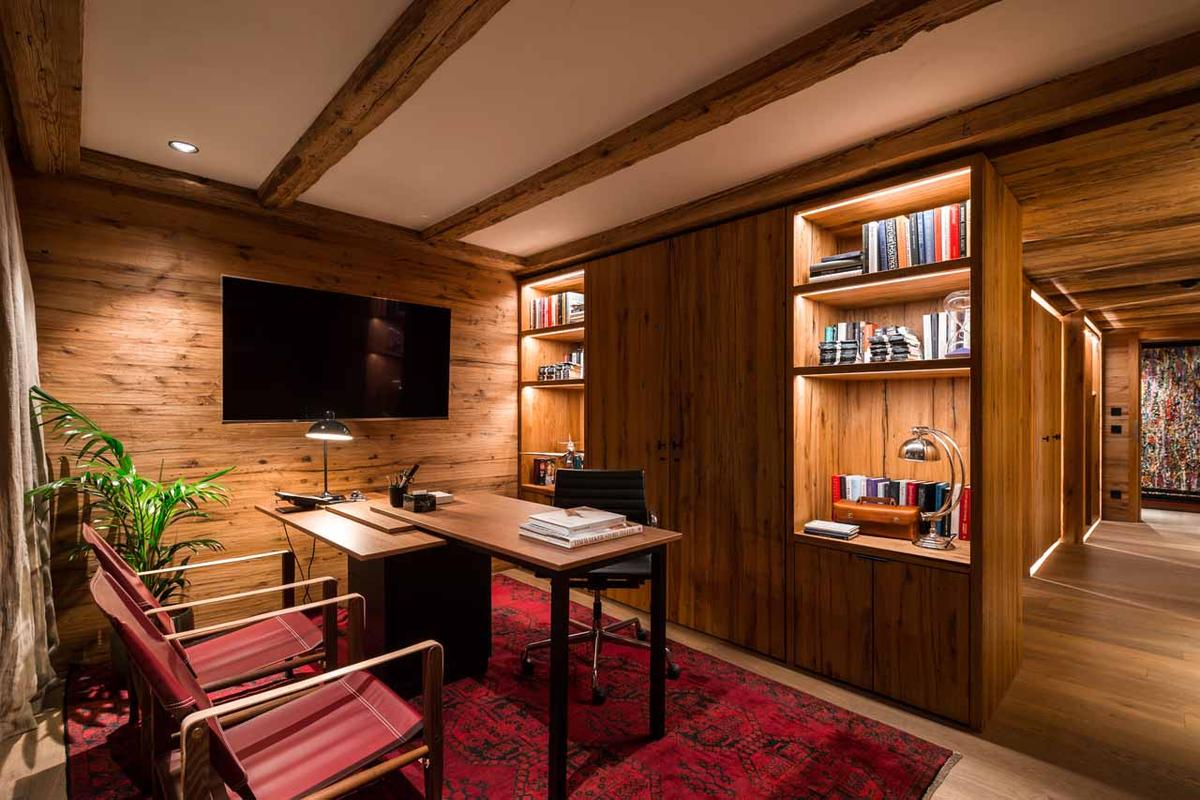 Inside, the chalet exudes style with elegant furnishings and décor. A spacious open-plan living and dining area features a central fireplace and ample seating, complemented by a fully-equipped kitchen and an office space for work needs. Multiple terraces and balconies showcase inspiring views of Lech's stunning peaks.