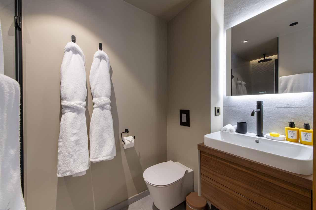 Second Floor: Three elegantly designed bedrooms include two doubles with en-suite bathrooms (separate showers) and one double with an en-suite shower room. All rooms blend modern aesthetics with chalet warmth, featuring wood accents, sleek black fixtures, and serene grey-tiled bathrooms.