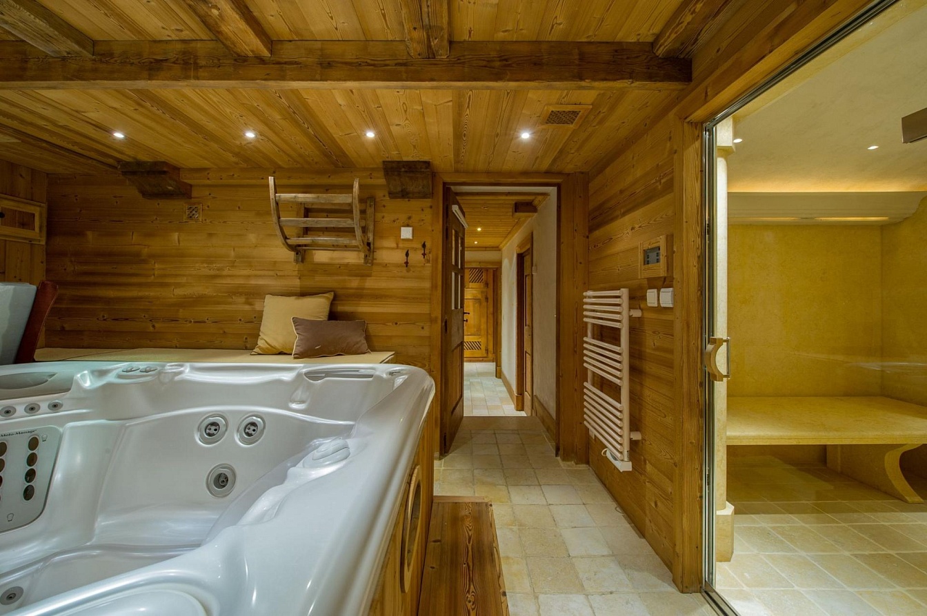 The top-floor open-plan living area is the social heart of the chalet, where a grand, stone feature fireplace reaches for the vaulted ceiling. Plush sofas and elegant alpine décor create an inviting atmosphere for post-ski gatherings, while the formal dining area and fully-equipped kitchen cater to sophisticated entertaining. For ultimate relaxation, descend to the lower-level wellness sanctuary—a spa complex complete with a soothing Jacuzzi, revitalising sauna, and spacious Hammam. Adjacent, a dedicated cinema room with comfortable sofas offers the perfect setting for movie nights.