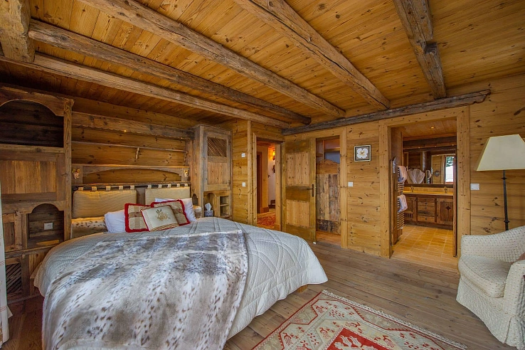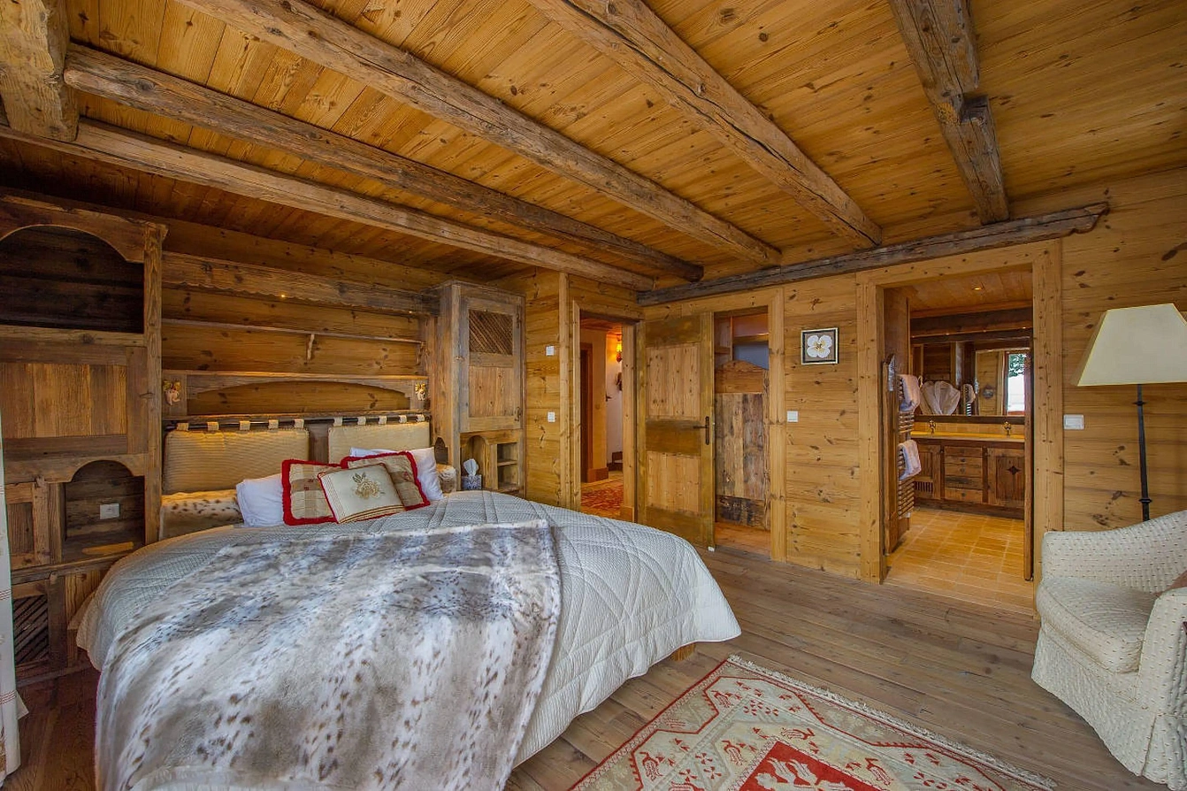 This 350m² chalet spans four levels and features an elevator for seamless access. Guests are treated to a state-of-the-art wellness area with a Jacuzzi, Hammam, sauna, and a TV lounge. The interior is a masterful blend of honey-brown timbers, vaulted ceilings, and exposed beams, accented with deep-pile rugs, plush sofas, and an open fireplace. Multiple balconies and terraces provide ample opportunity to soak in the magnificent southeast-facing mountain vistas.