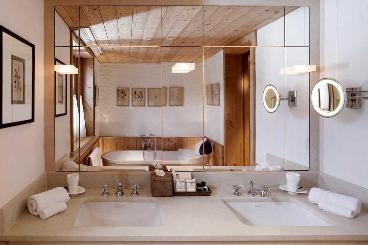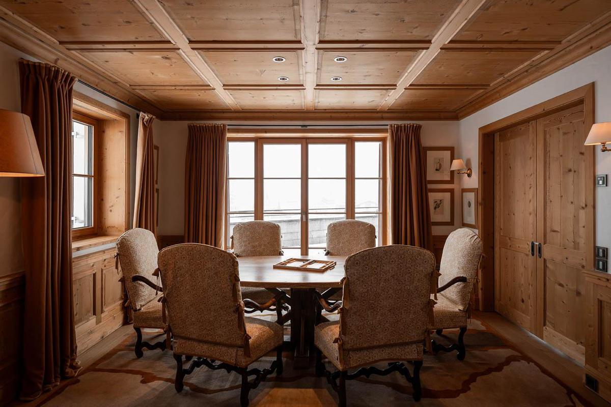 The elegant dining room boasts piste views, complemented by a small office and a well-equipped kitchen. The private spa features an 18-meter indoor pool with a surround-sound cinema screen and loungers, alongside a steam room, sauna, hot tub, and treatment rooms. Guests also have access to the hotel’s gym and spa facilities.