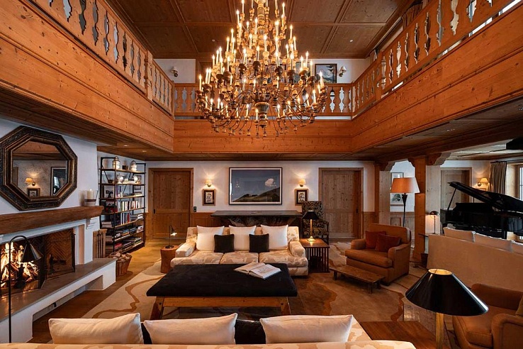 The chalet's interior blends traditional Alpine bedrooms with contemporary living spaces. An expansive galleried living room features an open fireplace and a stunning chandelier, surrounded by plush sofas. The cozy ceramic-oven-warmed library offers a perfect retreat after a day on the slopes.