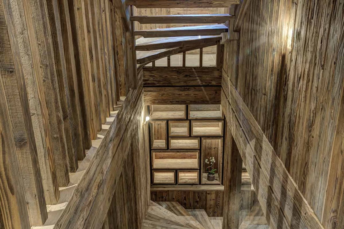 Ideal for groups of up to 16 guests, Cham137 features a spacious open-plan living area adorned with expansive glass windows offering breathtaking views of the surrounding peaks. A central 360° fireplace creates a cozy ambiance, complemented by sink-in sofas and beanbags nestled in a corner of the living space.