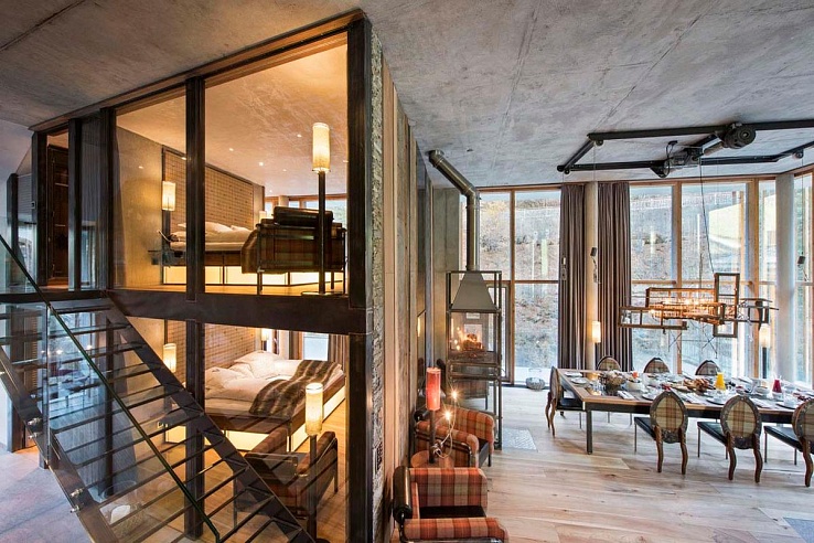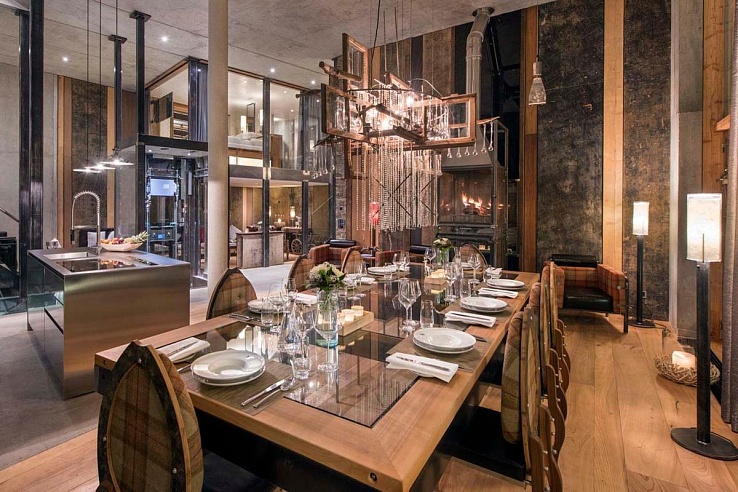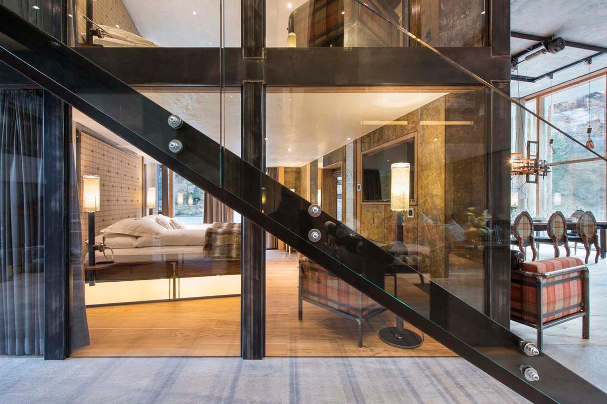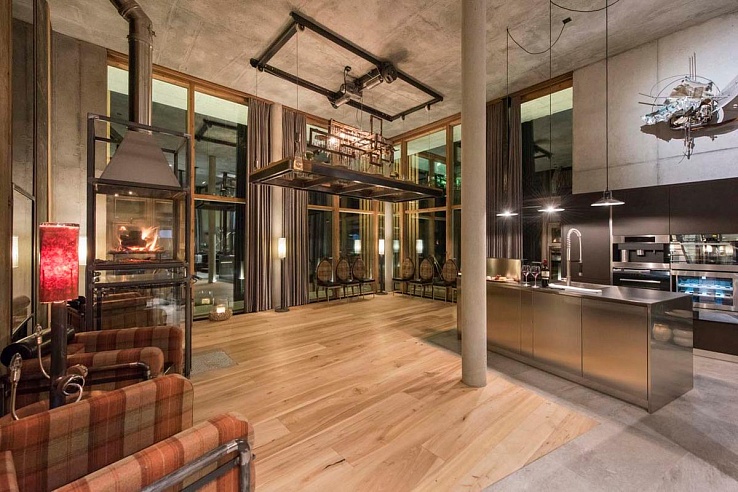 The loft's expansive open-concept layout encompasses a living, dining, and kitchen space highlighted by soaring ceilings, robust steel pillars, captivating contemporary artworks, and panoramic windows framing the majestic Matterhorn. Additional features include sleek glass and chrome finishes, a warm wood-burning fireplace, and exquisite chandeliers.