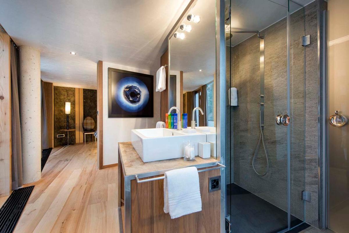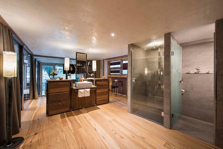 Adjacent to the primary living space, an inviting hot tub, encased in glass, effortlessly slides open, unveiling the awe-inspiring mountain panorama and infusing the ambiance with crisp Swiss alpine air.