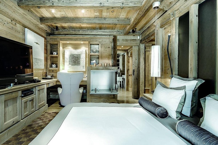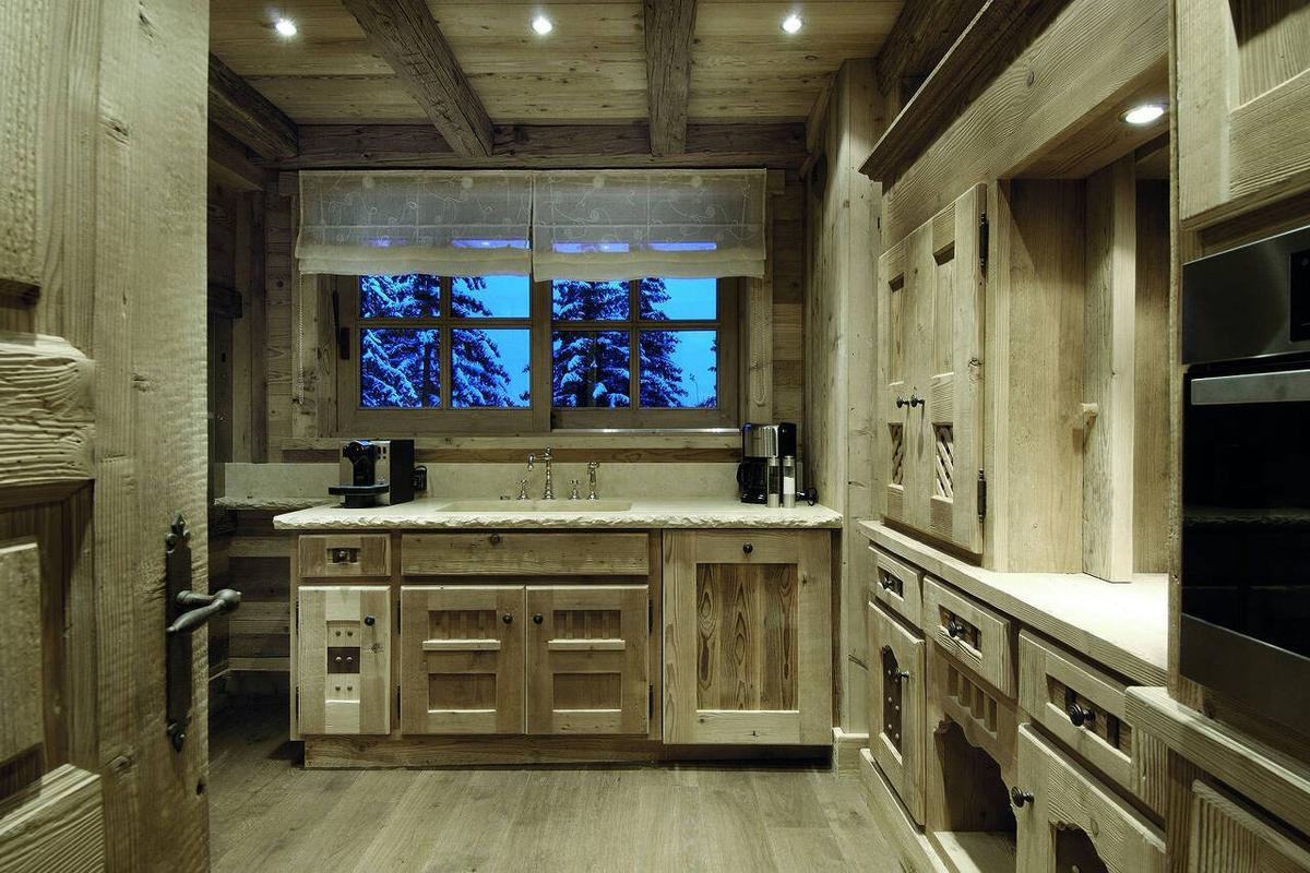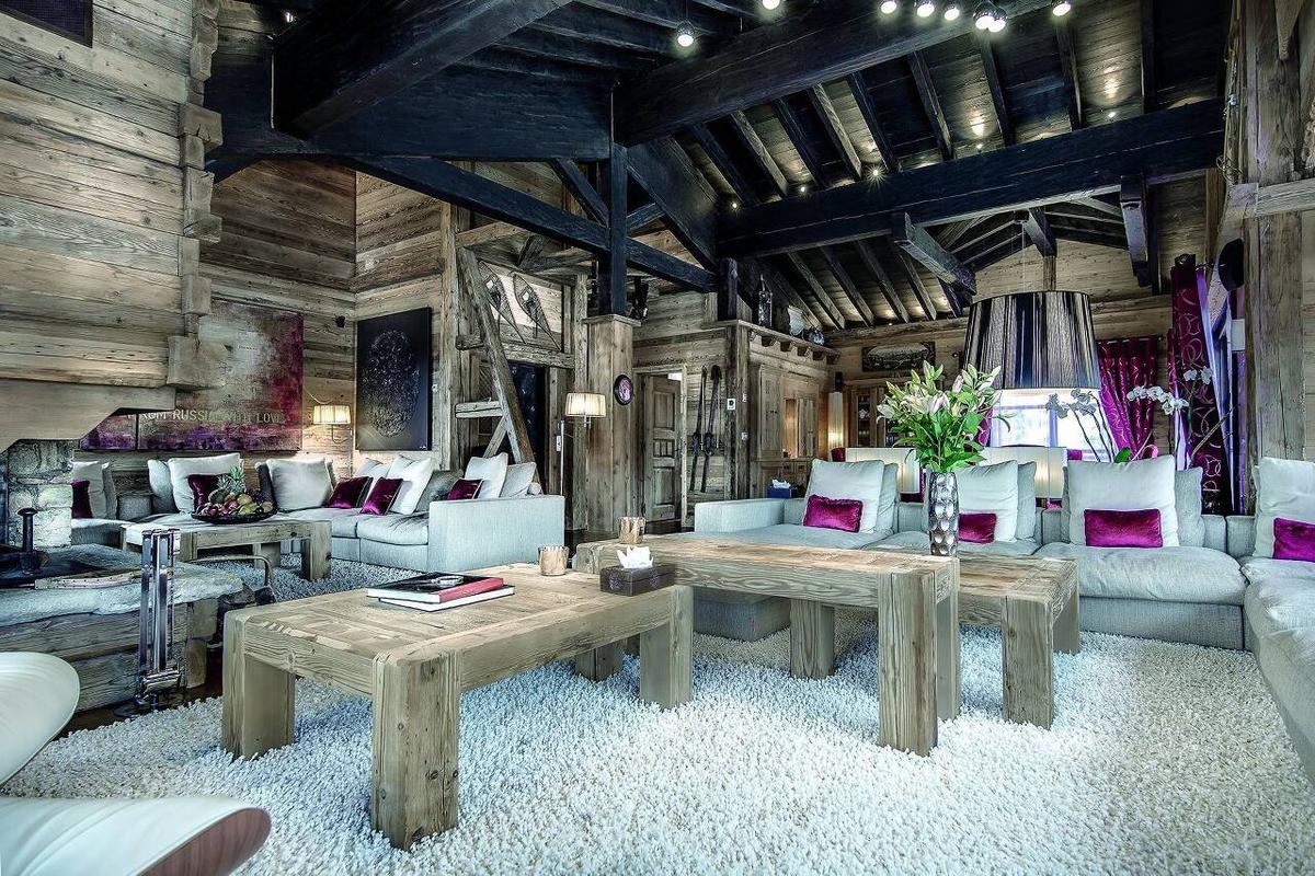 On the top floor, beneath lofty vaulted ceilings adorned with black wood beams, you'll discover the chic living and dining area. Adorned with stylish upholstered furnishings, modern lighting, plush fabrics, and a grand open fireplace, this space offers balcony access and breathtaking panoramic views of the Courchevel ski area. Traditional Alpine elements like wooden floors and exposed beams imbue the property with a cozy mountain charm. The well-appointed closed kitchen allows you or your private chef to whip up delectable meals.