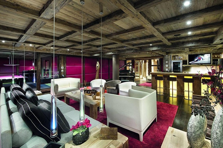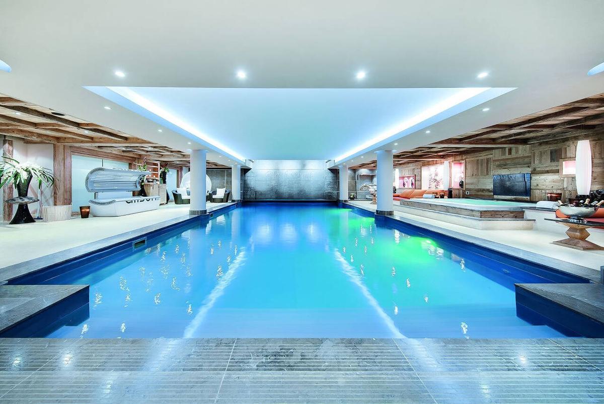 The chalet boasts a 14 x 4-meter indoor swimming pool, surrounded by lounging areas, a fully-equipped gym, and an indoor Jacuzzi. Sun enthusiasts can bask in the UV bed for a tan top-up. For ultimate relaxation, indulge in the hammam, spacious sauna, or tranquil massage room. Additional amenities include a ski room with boot warmers, a guest WC, and a three-car garage.