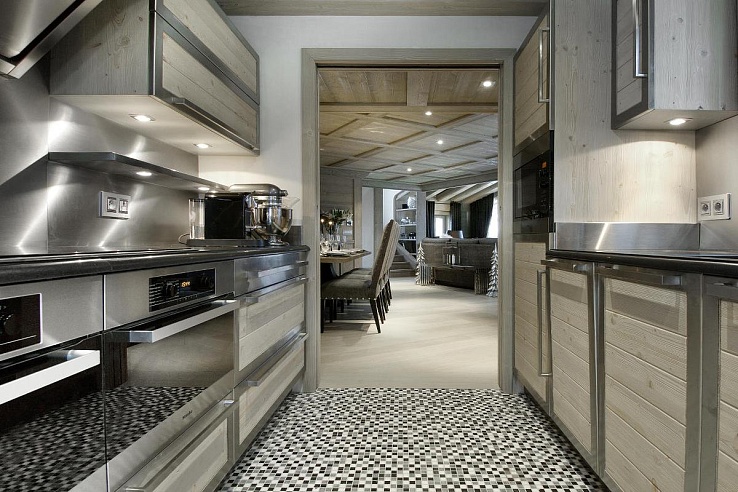 On the first floor, the captivating open-plan living and dining room at Val-86 boasts picture windows that open onto a balcony, allowing guests to immerse themselves in the breathtaking mountain surroundings. A large fireplace and luxurious sofas create a cozy ambiance for snowy evenings, adorned with exquisite touches of Andrew Martin materials and local Savoyard artifacts.