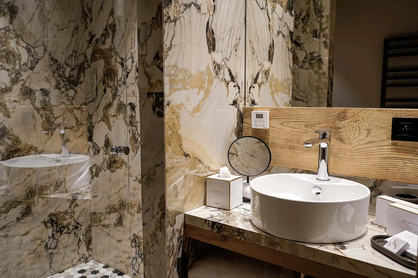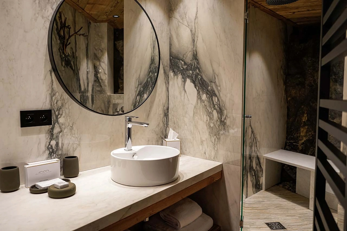 Five beautifully appointed bedrooms provide a comfy and cosy retreat, inviting you to disconnect in total privacy. Four elegant double rooms feature en-suite facilities, while a fifth room, perfect for children, is equipped with two bunk beds and a pull-out bed. Each space is designed with a unique, refined aesthetic to ensure a restful night's sleep after a day in the mountains.