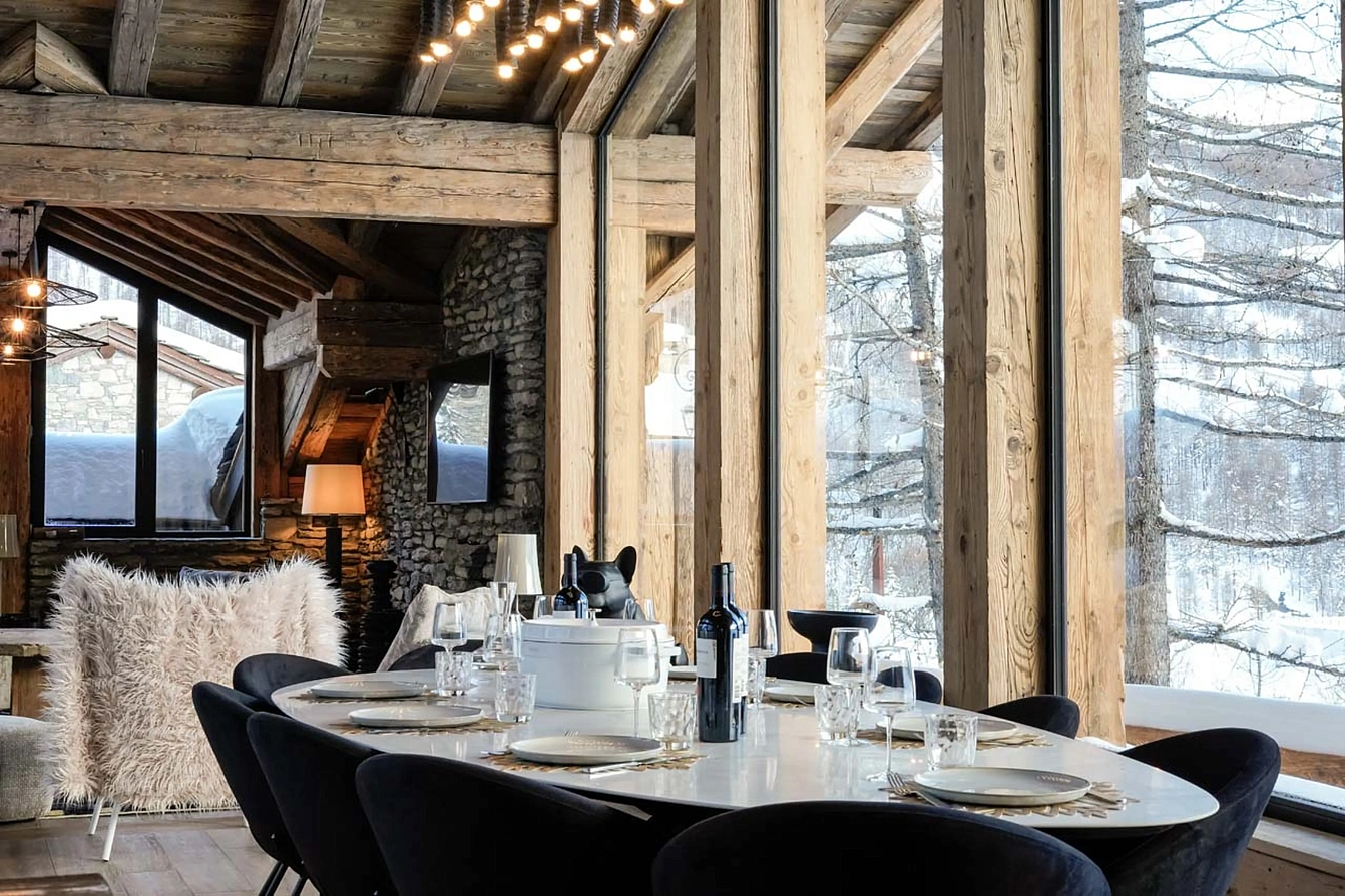 Val-485 is set in the tranquil, forest-fringed hamlet of Le Cret, a 3-minute drive or a 15-minute walk from Val d'Isère's vibrant centre. The open-plan living and dining area is designed for memorable gatherings, featuring high ceilings, refined elegant decoration, and expansive windows that frame the stunning peaks. Accommodating up to 13 guests across five bedrooms, this 300m² property seamlessly blends the comfort of a family home with attentive hotel-style services.