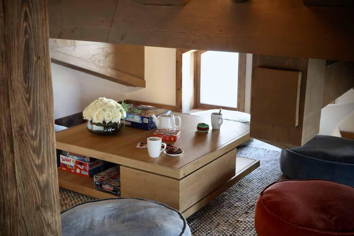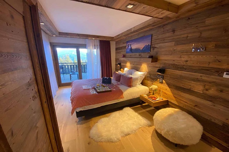 The subterranean spa rivals five-star retreats: glide into the 8m indoor pool under a celestial fiber-optic sky, then detox in the cedar sauna or eucalyptus-scented hammam. For convivial moments, the mezzanine hosts a cognac leather media lounge and oak game table (backgammon to poker). Post-ski, gather for Veuve Clicquot in the jacuzzi as sunset gilds the Vanoise peaks.