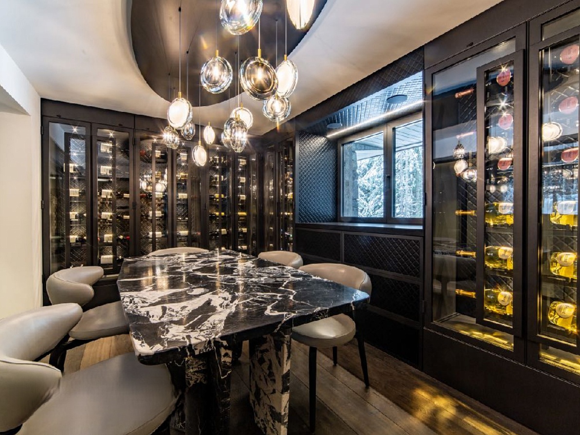 The heart of Cour429 is its expansive open-plan living and dining area, anchored by a majestic central fireplace. Floor-to-ceiling windows bathe the space in natural light and offer captivating forest views. Elegant yet comfortable seating surrounds the fire, while a substantial dining table provides the perfect setting for gourmet meals curated by your private chef. A sophisticated bar area and separate wine cellar cater to discerning tastes.