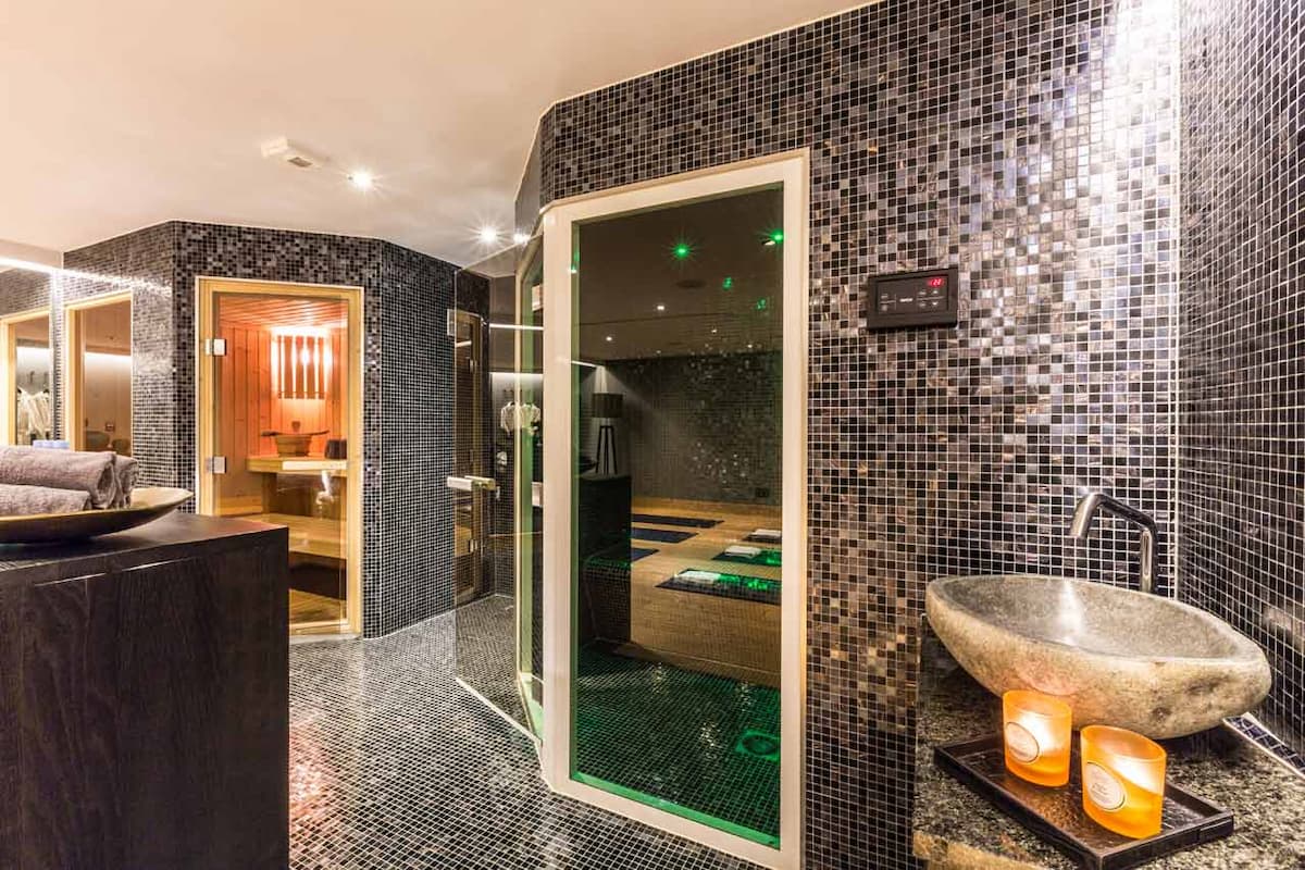 Dedicated wellness awaits on the lower level within a sophisticated spa suite: rejuvenate in the sauna and Hammam, indulge in treatments on dedicated massage tables, or find balance in the yoga/Pilates studio. An adjacent gym caters to fitness enthusiasts.