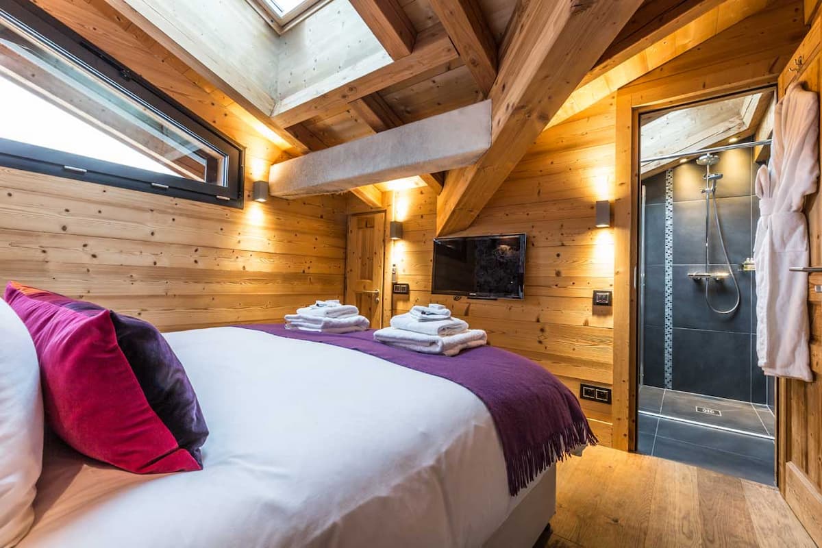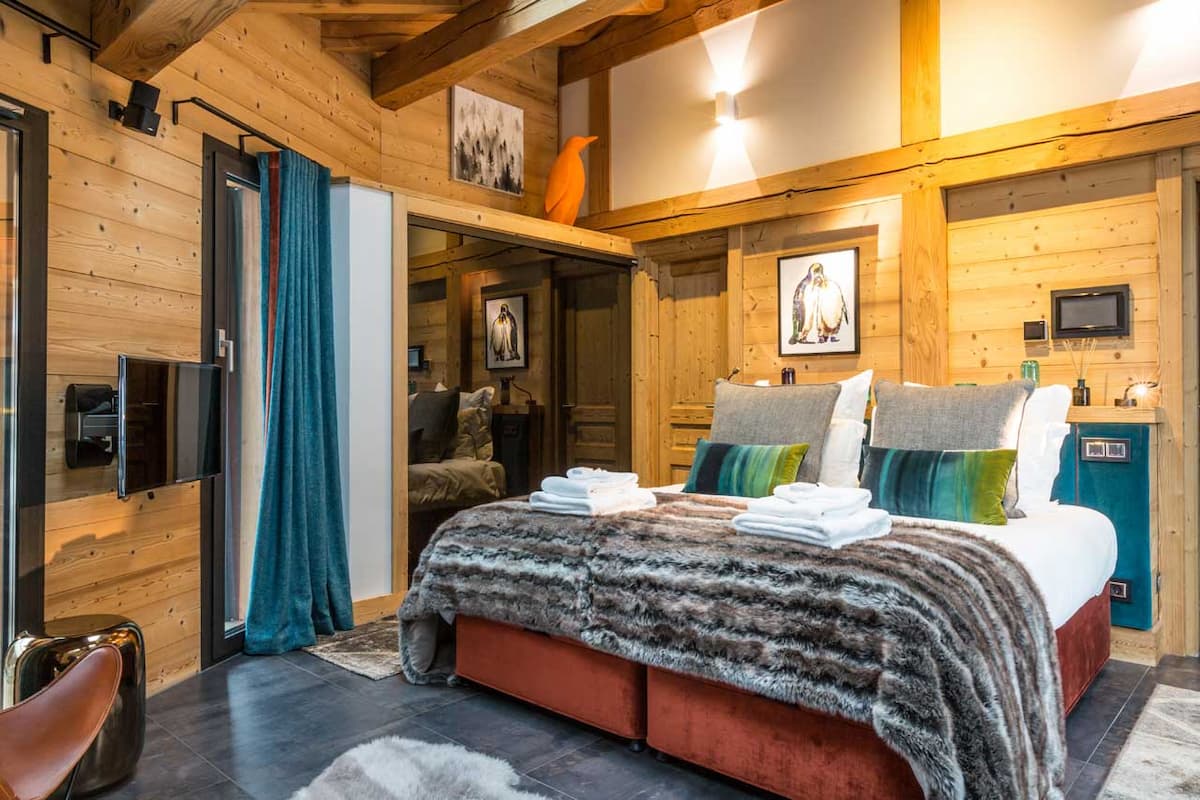 Each of Cham318’s five en-suite bedrooms unfolds as a curated design masterpiece, blending avant-garde aesthetics with indulgent comfort. The Master Penguin Suite reigns supreme with its super-king bed, freestanding sculptural bathtub, and private garden access leading directly to the steamy embrace of the outdoor hot tub. Its counterpart, the Master Fox Suite, seduces with a super-king haven and freestanding soaking tub, effortlessly transforming into a private family enclave when connected to the adjacent Wolf Room—a chic double/twin retreat ideal for companions or younger guests. Vibrant energy radiates from the Butterfly Room, where balcony panoramas meet playful elegance, while the Stag Room exudes noble sophistication with its refined alpine palette and private balcony sanctuary. Every suite whispers exclusivity, inviting guests to unwind in spaces where artistry meets alpine soul.
