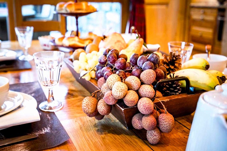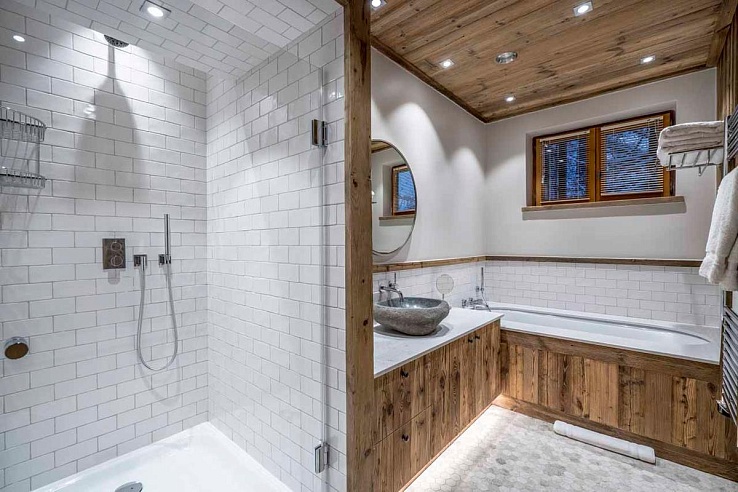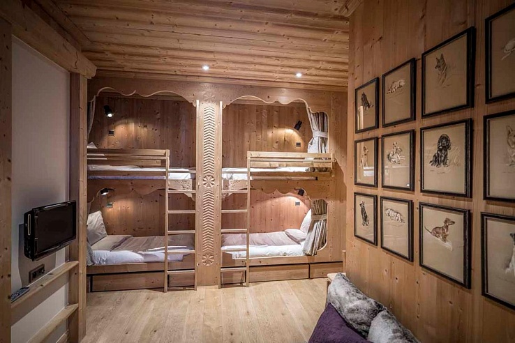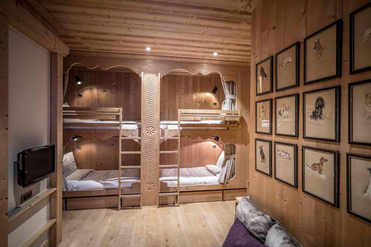 The chalet comprises four deluxe en-suite bedrooms, three doubles, and a children’s bunk room accommodating four. Each bedroom is furnished with TVs, while the exquisite bathrooms feature Italian marble finishes.