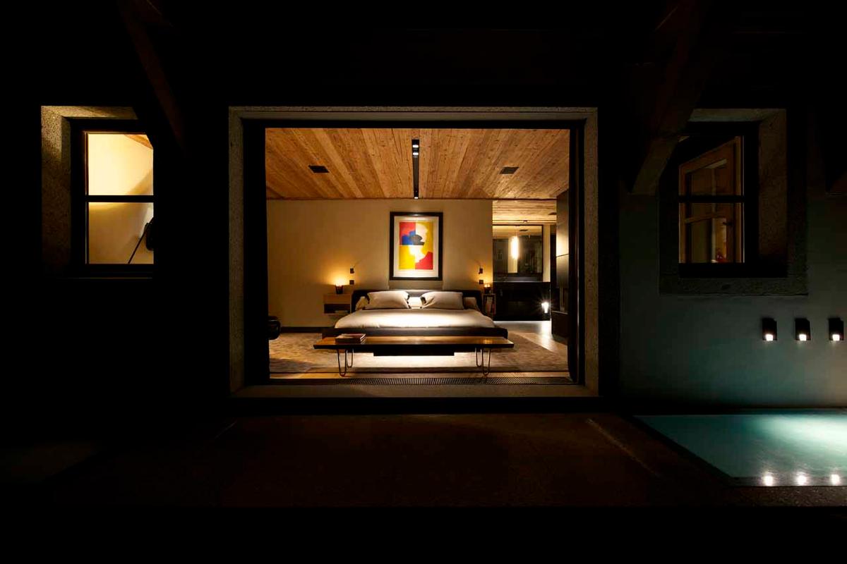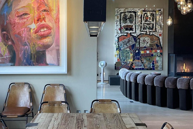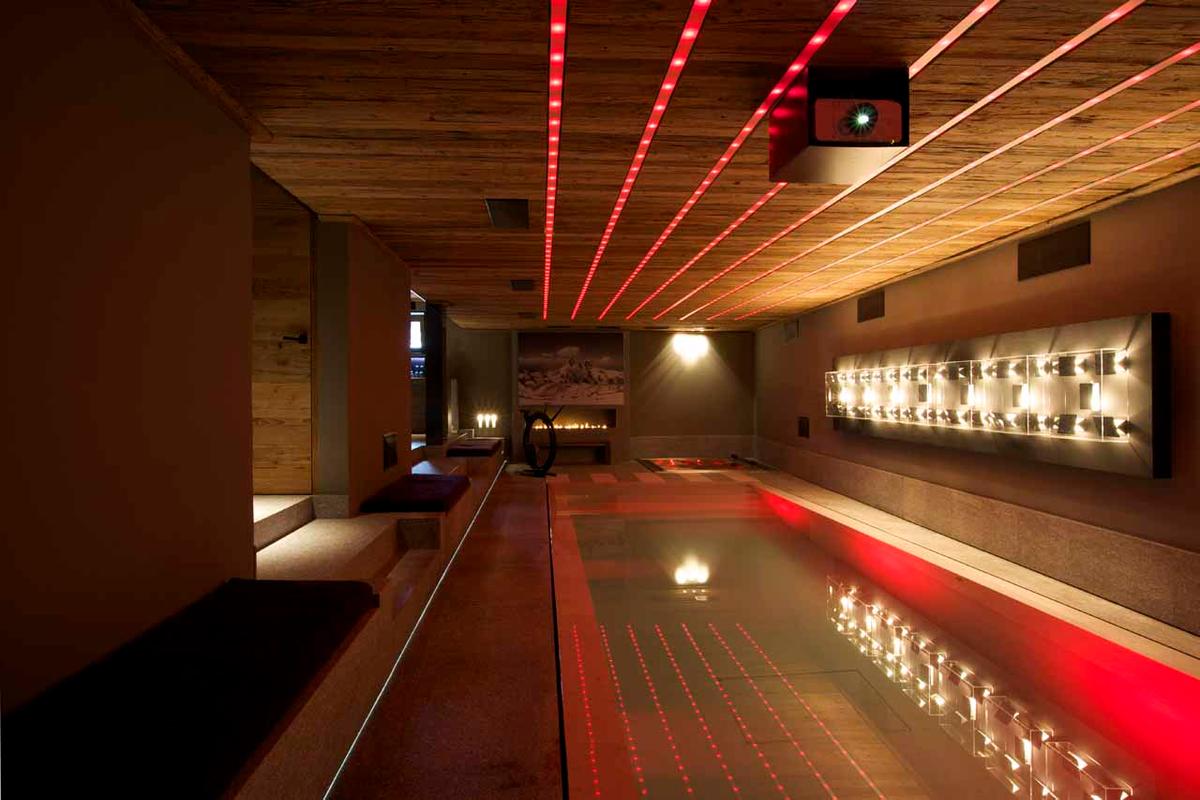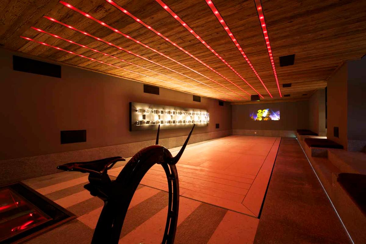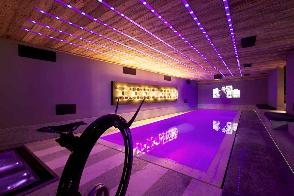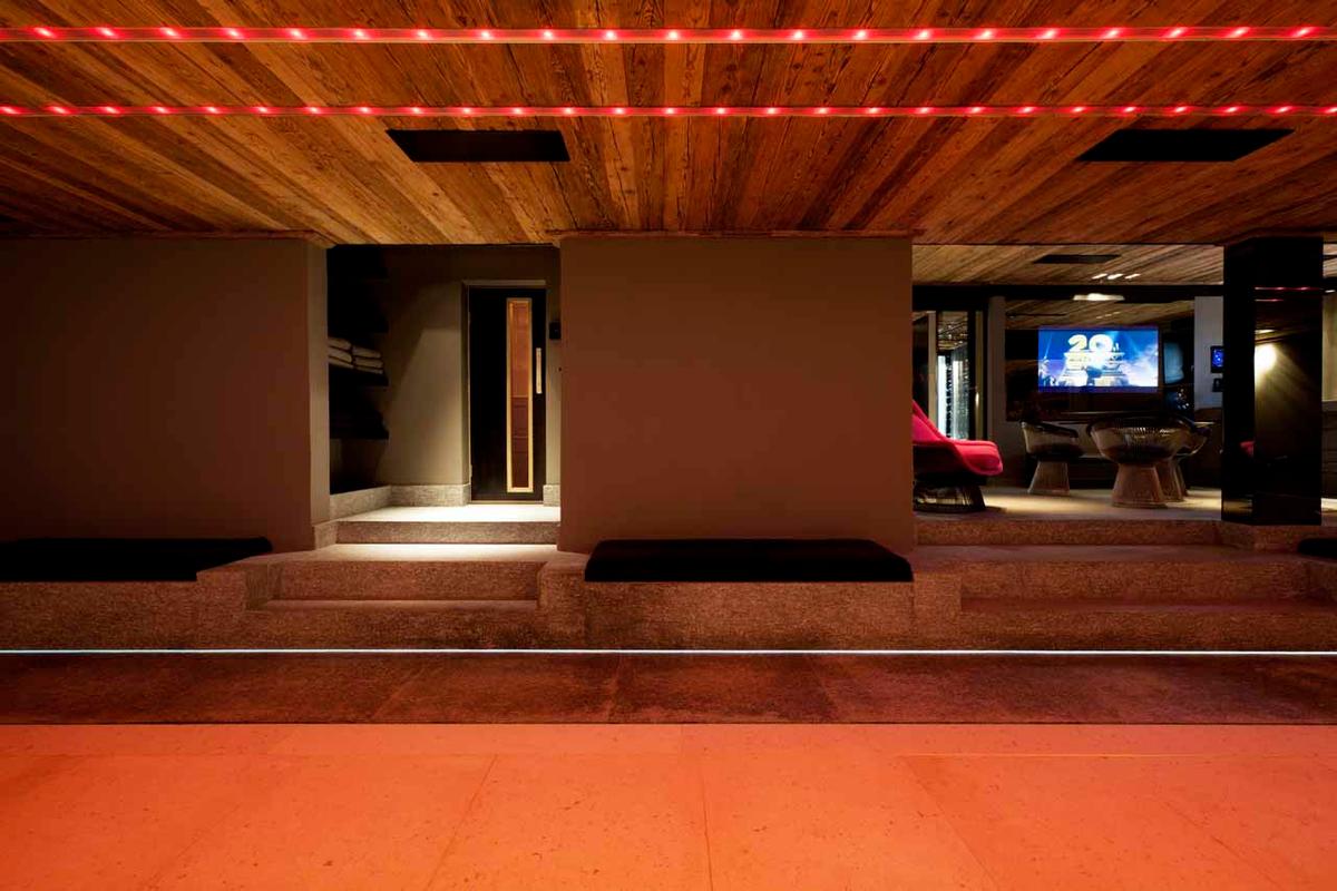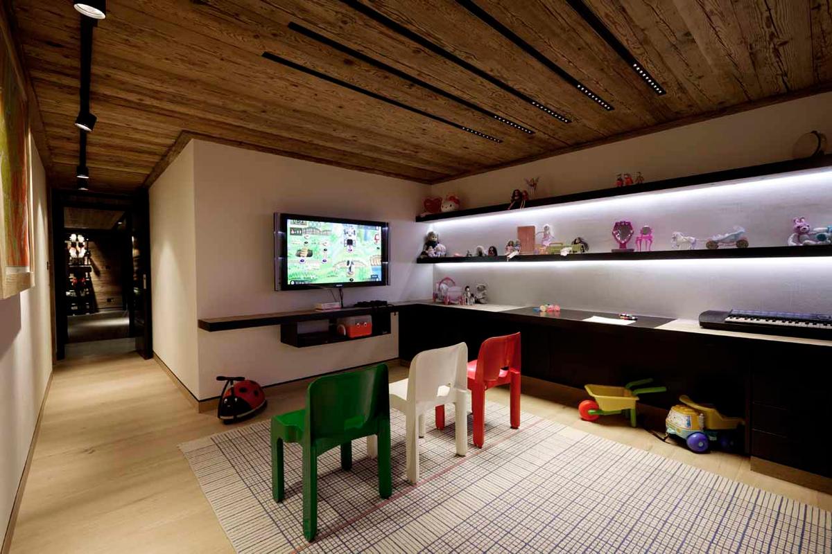 Обеденная зона с брутальным столом на 8 человек соседствует с современной кухней, отделенной от общего пространства стойкой для завтраков на три места. Этаж гостиной с трех сторон окружен широким балконом с небольшой открытой кухней для обслуживания апре-ски посиделок на фоне живописных видов. Для яркого досуга всех поколений в шале есть кинозал с ярусами кресел, игровая комната с игрушками для детей и грандиозная велнес зона с бассейном, превращающаяся в танцпол с баром. Благодаря стереосистеме, проектору и декоративному освещению зал с танцполом подходит для зажигательных вечеринок. Расслабиться и восстановить силы помогут спа-удобства, в числе которых сауна, джакузи, зона релаксации с душевой и комната для массажа и спа-процедур.