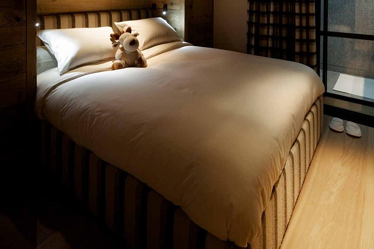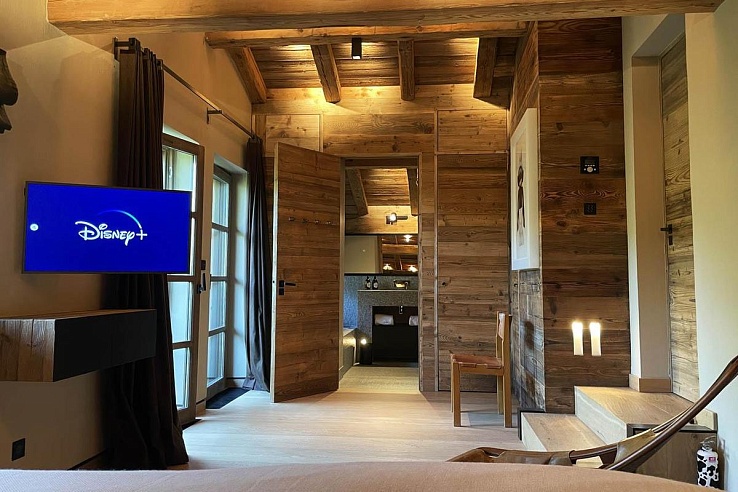Шесть спален с ванными комнатами рассредоточены на трех этажах и предлагают разный уровень комфорта. Звездная мастер спальня с гардеробной, камином на этаноле и террасой отличается площадью и расположена на этаже со спа-удобствами. Две уютные спальни размером поменьше имеют двуспальные /две односпальные кровати. На нижнем этаже рядом с игровой комнатой находятся две спальни с двуспальными кроватями без окон. Еще одна спальня предлагает пару ярусных кроватей для четверых детей.