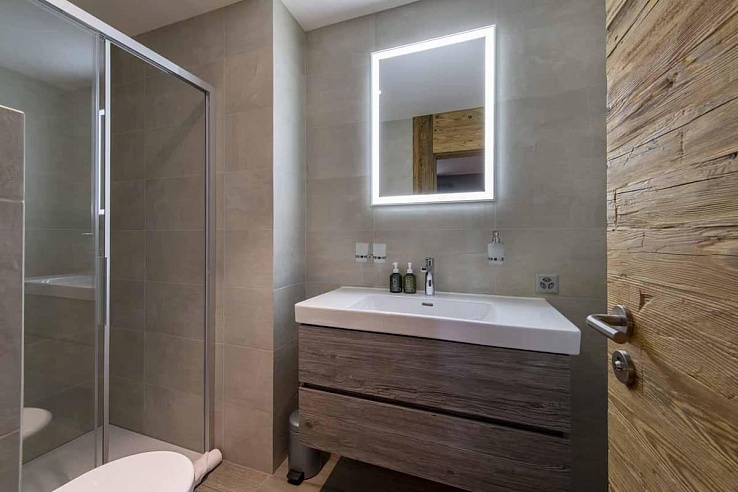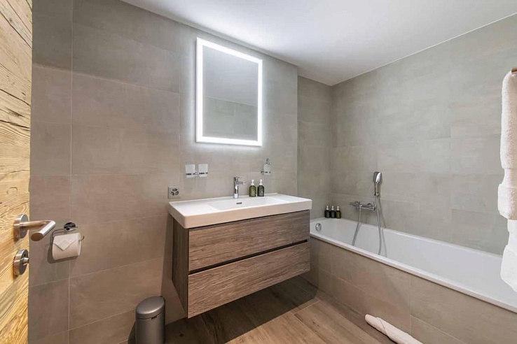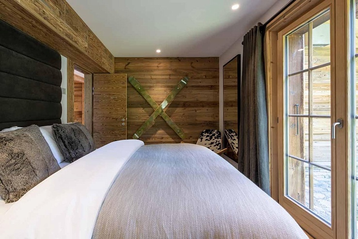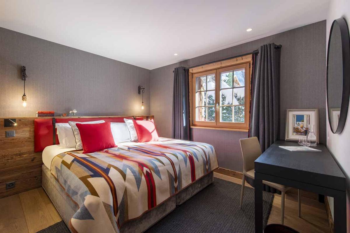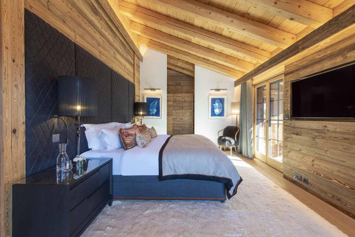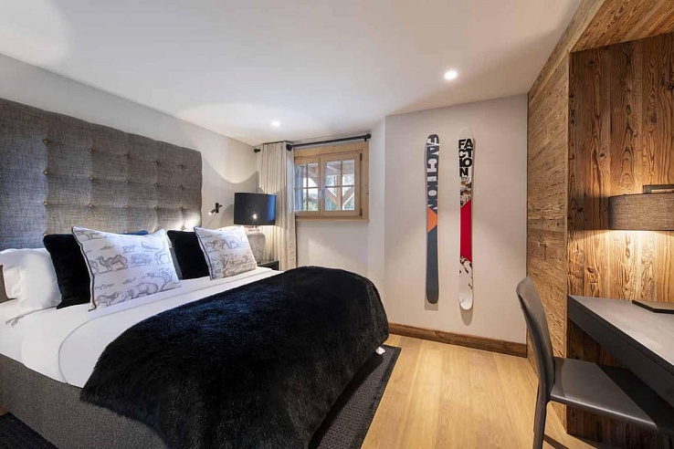 The impressive master bedroom, occupying the top level, boasts double-height ceilings, French windows leading to a private balcony and terrace, a dressing area, and an en-suite bathroom. The four additional en-suite bedrooms, located on the first and ground levels, showcase the same chic style with generous proportions. Three of these bedrooms offer the flexibility of twin beds. Some bedrooms feature desks, catering to those on a work-from-home ski holiday.